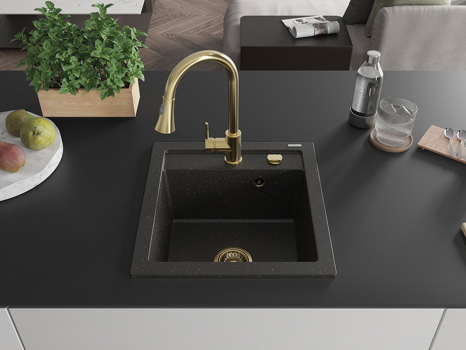 Mexen Vito 1-komorový žulový drez s kuchynskou batériou Elia, čierny/zlatý metalik - 6503-75-670101-50