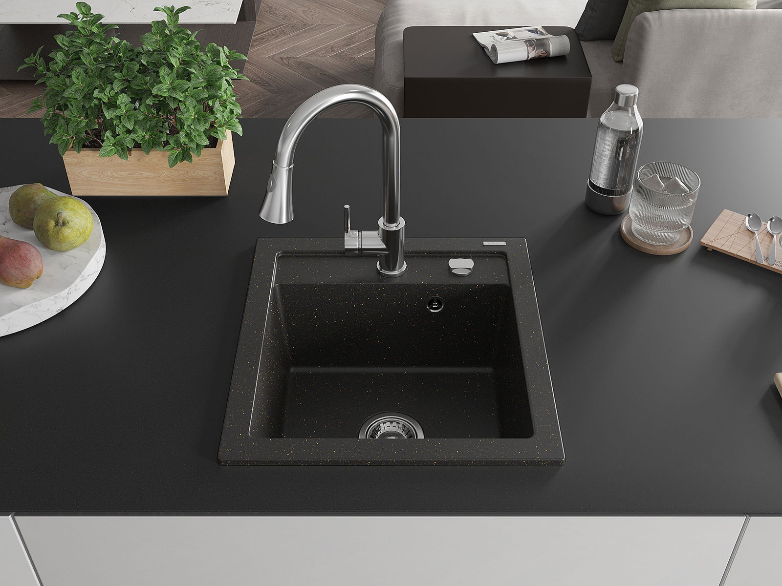 Mexen Vito žulový drez 1-komorový s kuchynskou batériou Elia, čierno/zlatý metalik - 6503-75-670101-00