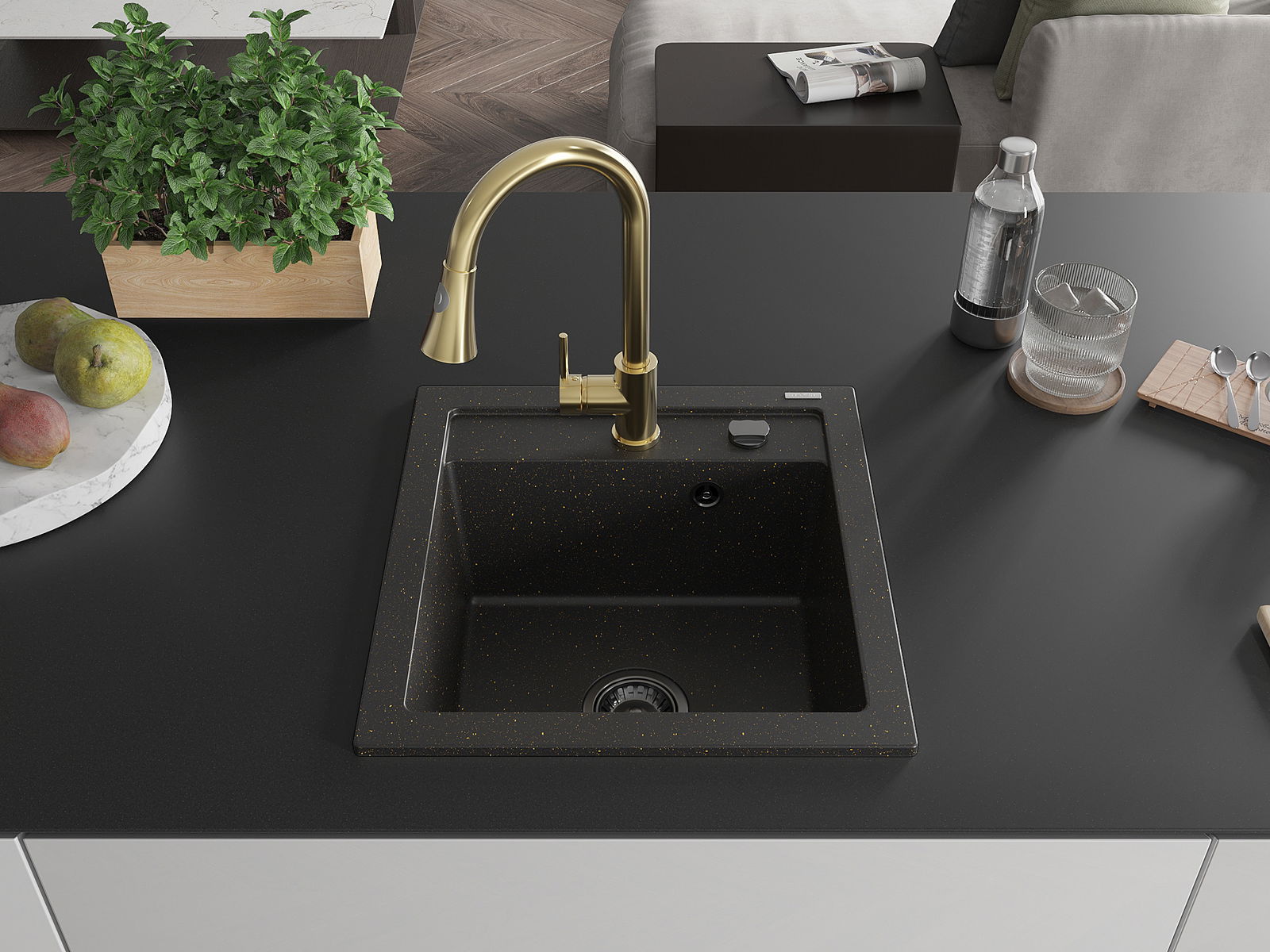 Mexen Vito žľabový granitový 1-komorový s kuchynskou batériou Elia, čierny/zlatý metalický - 6503-75-670101-50-B