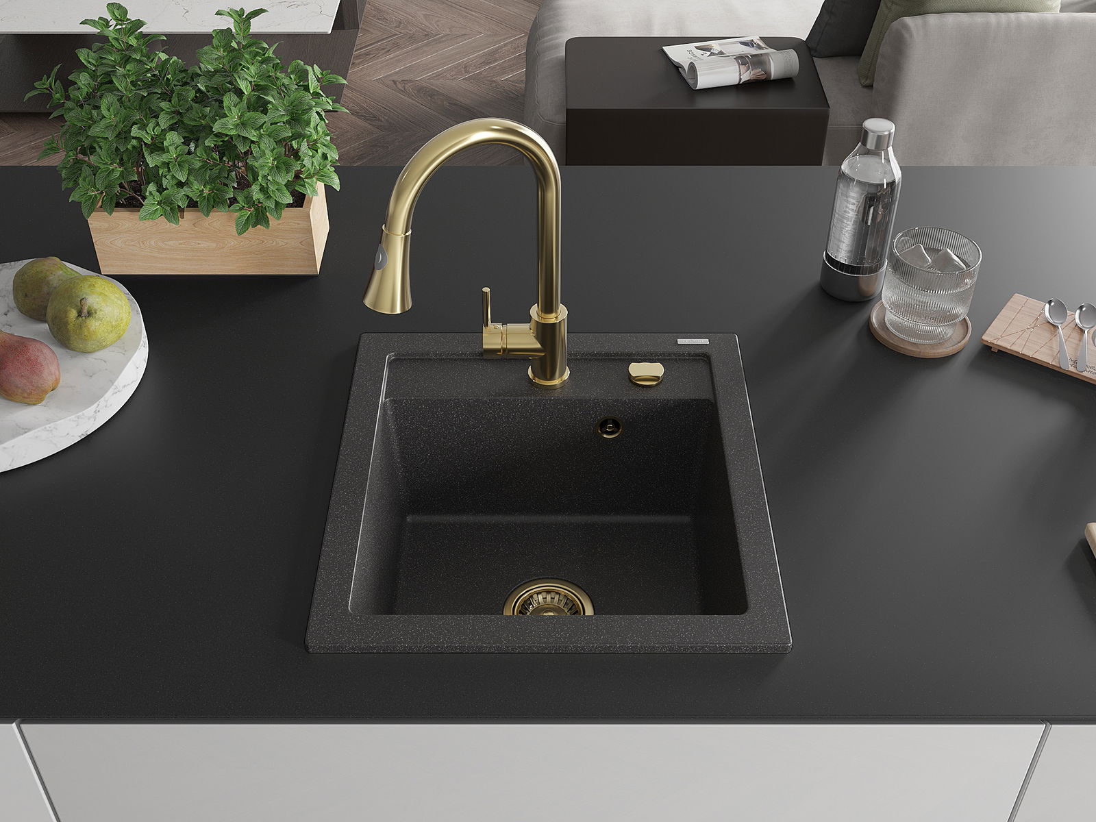 Mexen Vito žulový drez 1-komorový s kuchynskou batériou Elia, čierno-škvrnitý - 6503-76-670101-50