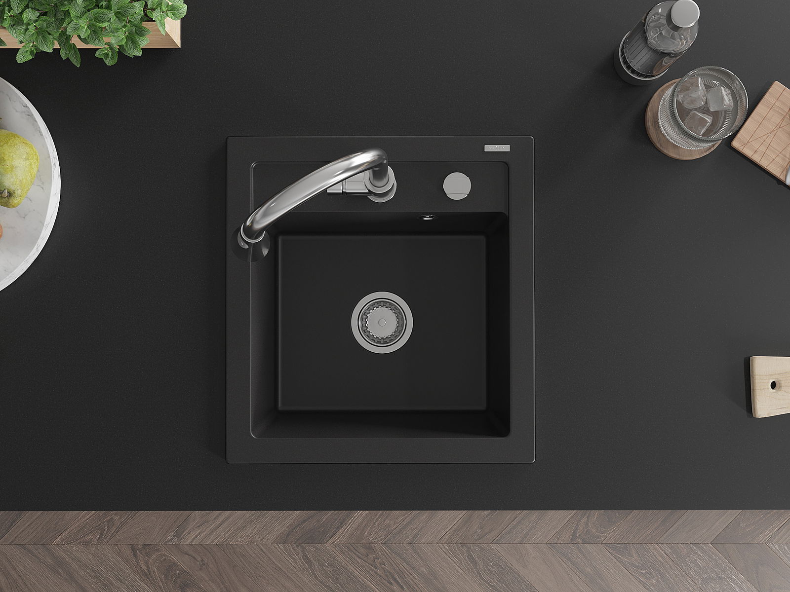 Mexen Vito žulový drez s 1-komorou a kuchynskou batériou Elia, čierny - 6503-77-670101-00