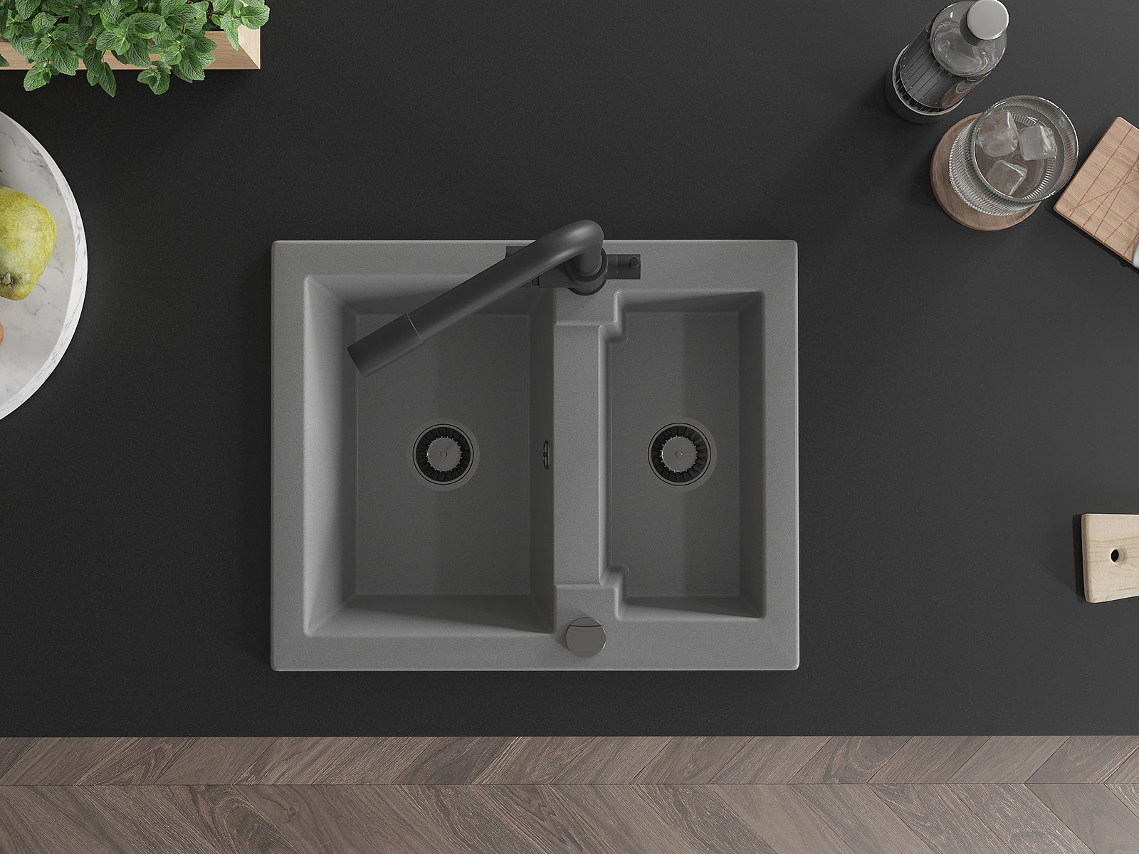 Mexen Carlos granitový kuchynský drez s 1,5 komorou a kuchynskou batériou Duero, šedý - 6518-71-671600-70-B