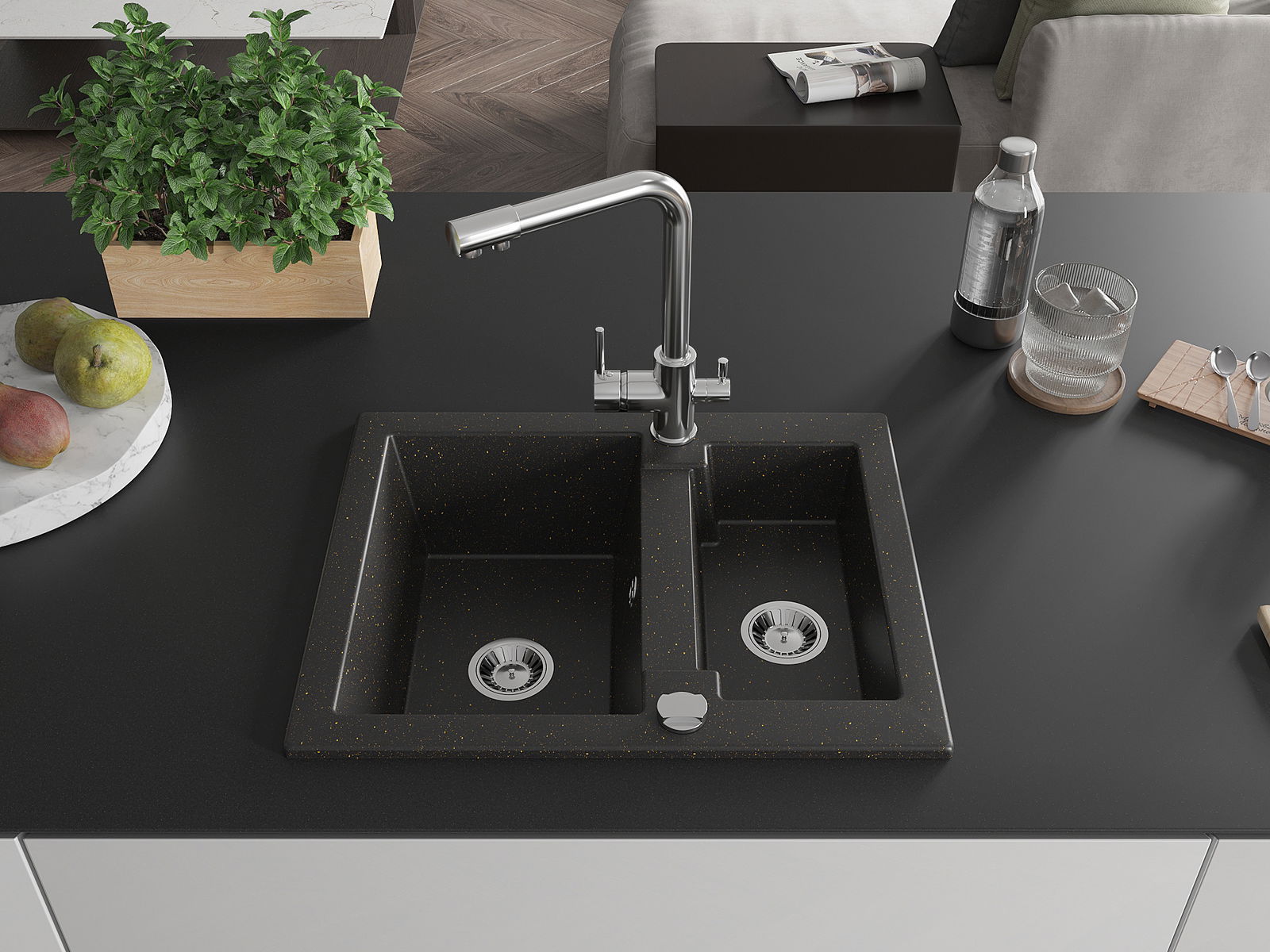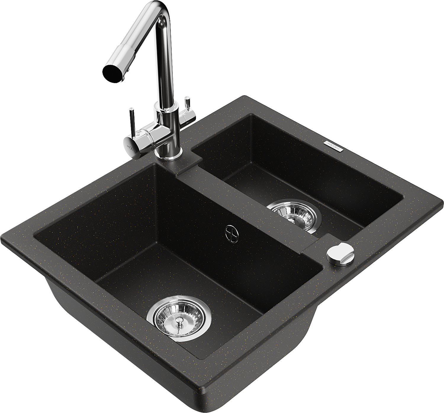 Mexen Carlos granitový drez 1,5-komorový s kuchynskou batériou Duero, čierny/zlatý metalik - 6518-75-671600-00