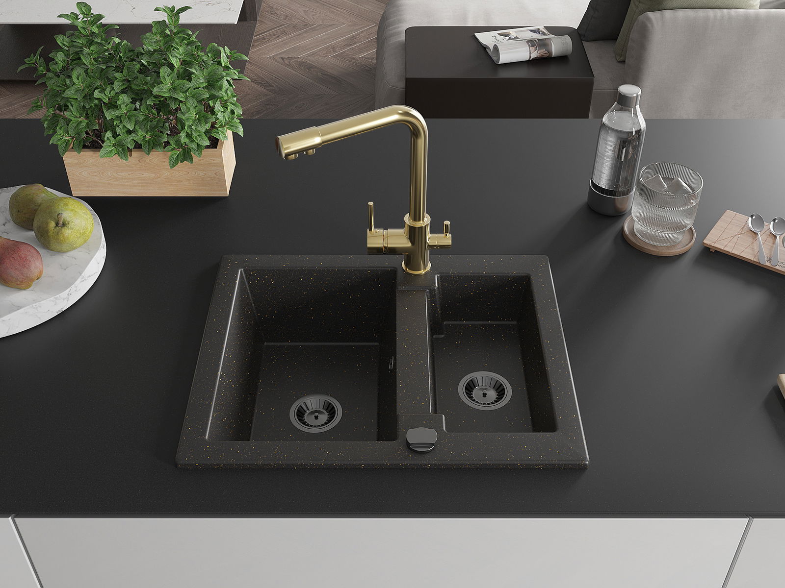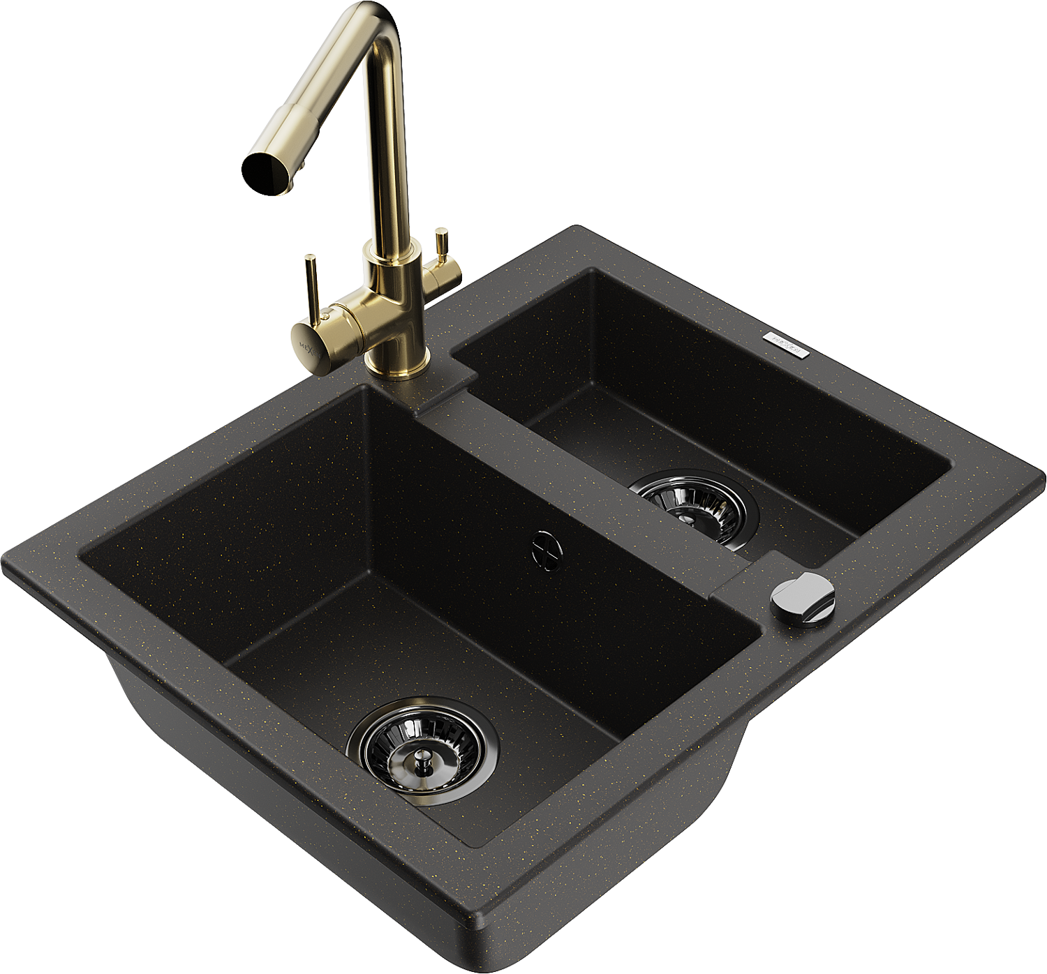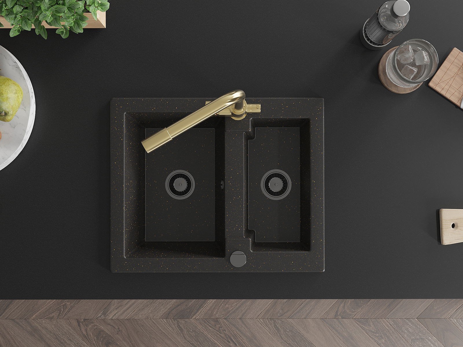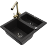 Mexen Carlos granitový drez 1,5-komorový s kuchynskou batériou Duero, čierny/zlatý metalik - 6518-75-671600-50-B
