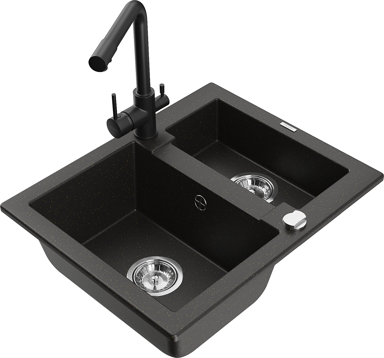 Mexen Carlos granitový kuchynský drez 1,5-komorový s kuchynskou batériou Duero, čierno/zlatý metalik - 6518-75-671600-70