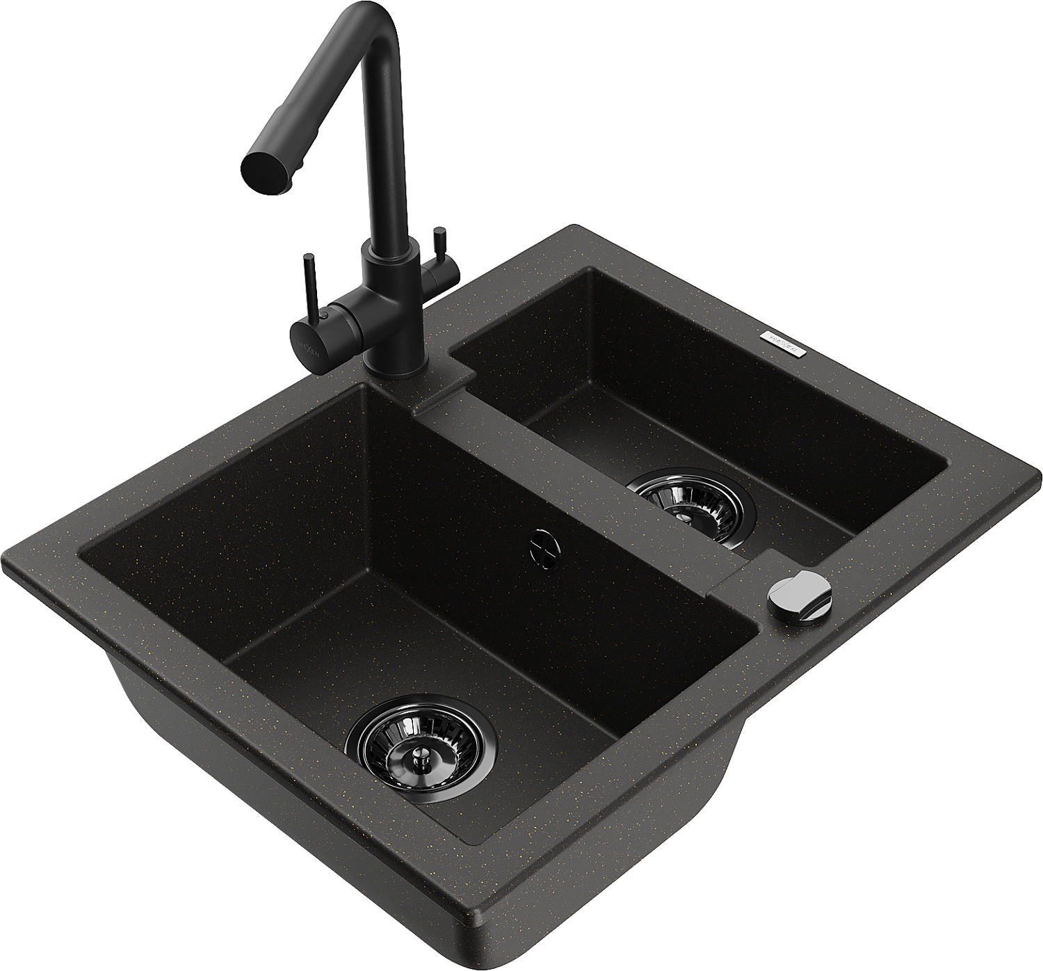 Mexen Carlos žulový drez 1,5-komorový s kuchynskou batériou Duero, čierna/zlatý metalik - 6518-75-671600-70-B