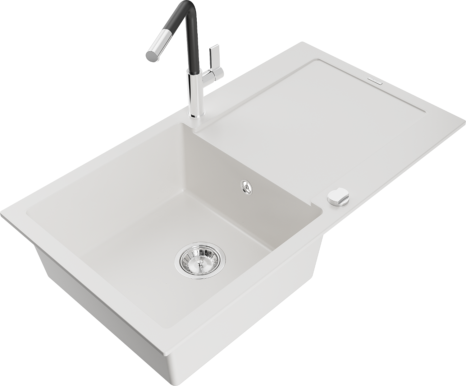 Mexen Leo žulový kuchynský drez 1-komorový s odkvapkávačom a kuchynskou batériou Flora, biely - 6501-20-670401-07