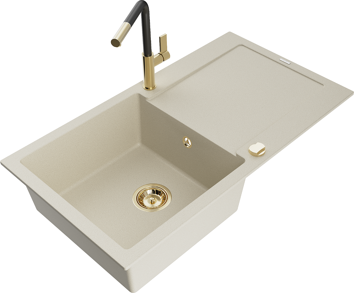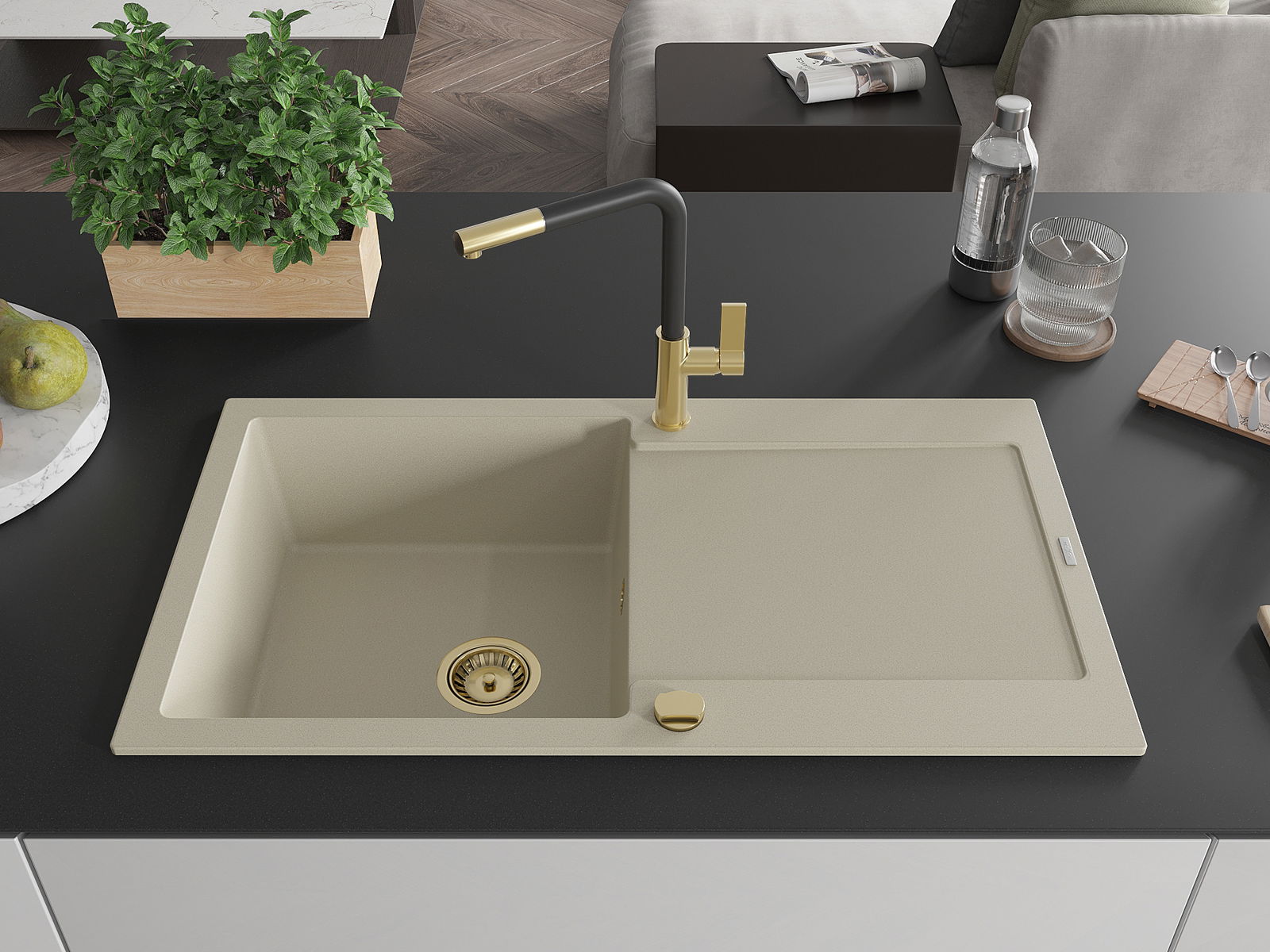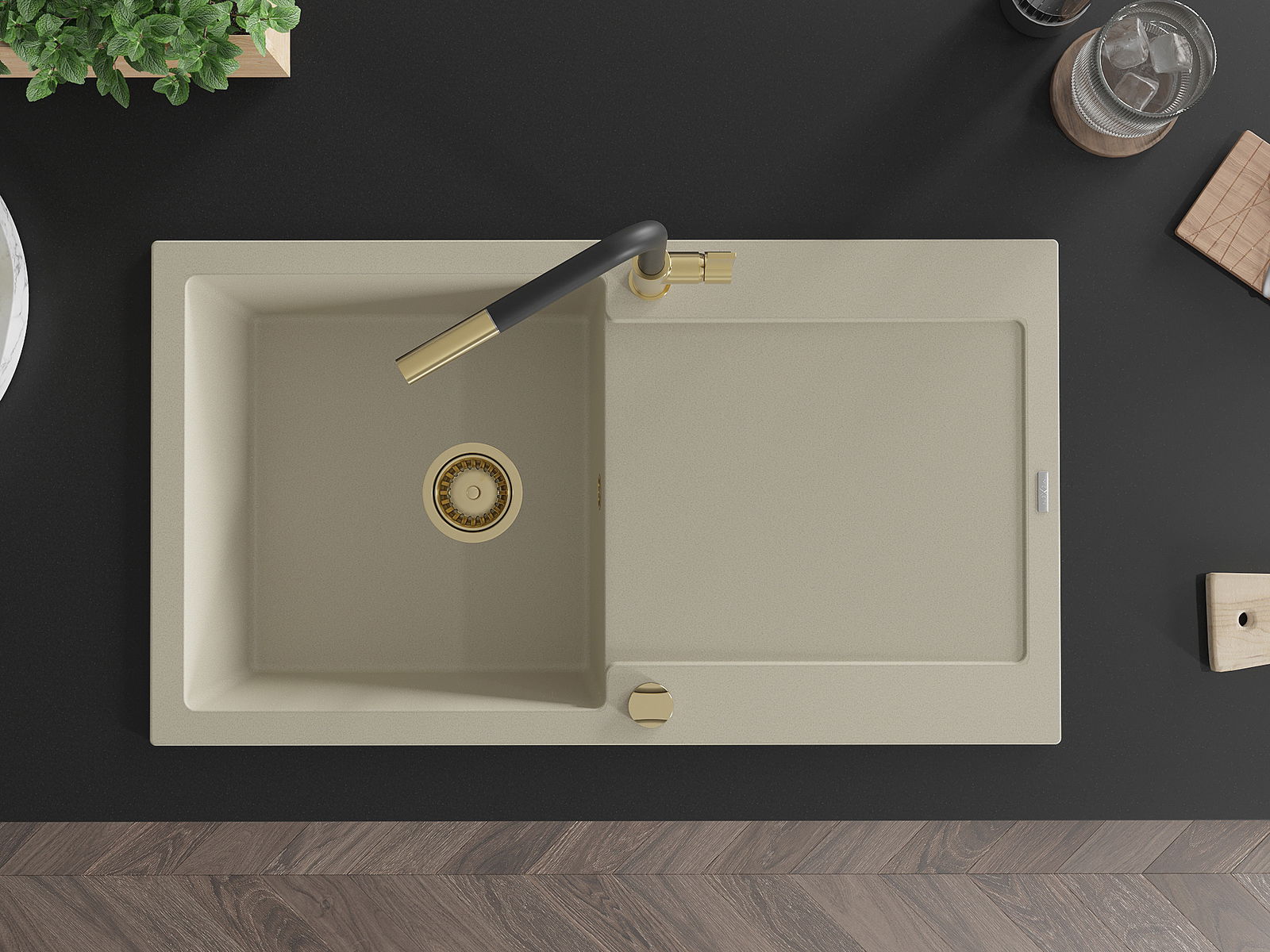 Mexen Leo granitový drez 1-komorový s odkvapkávačom a kuchynskou batériou Flora, béžový - 6501-69-670401-57-G