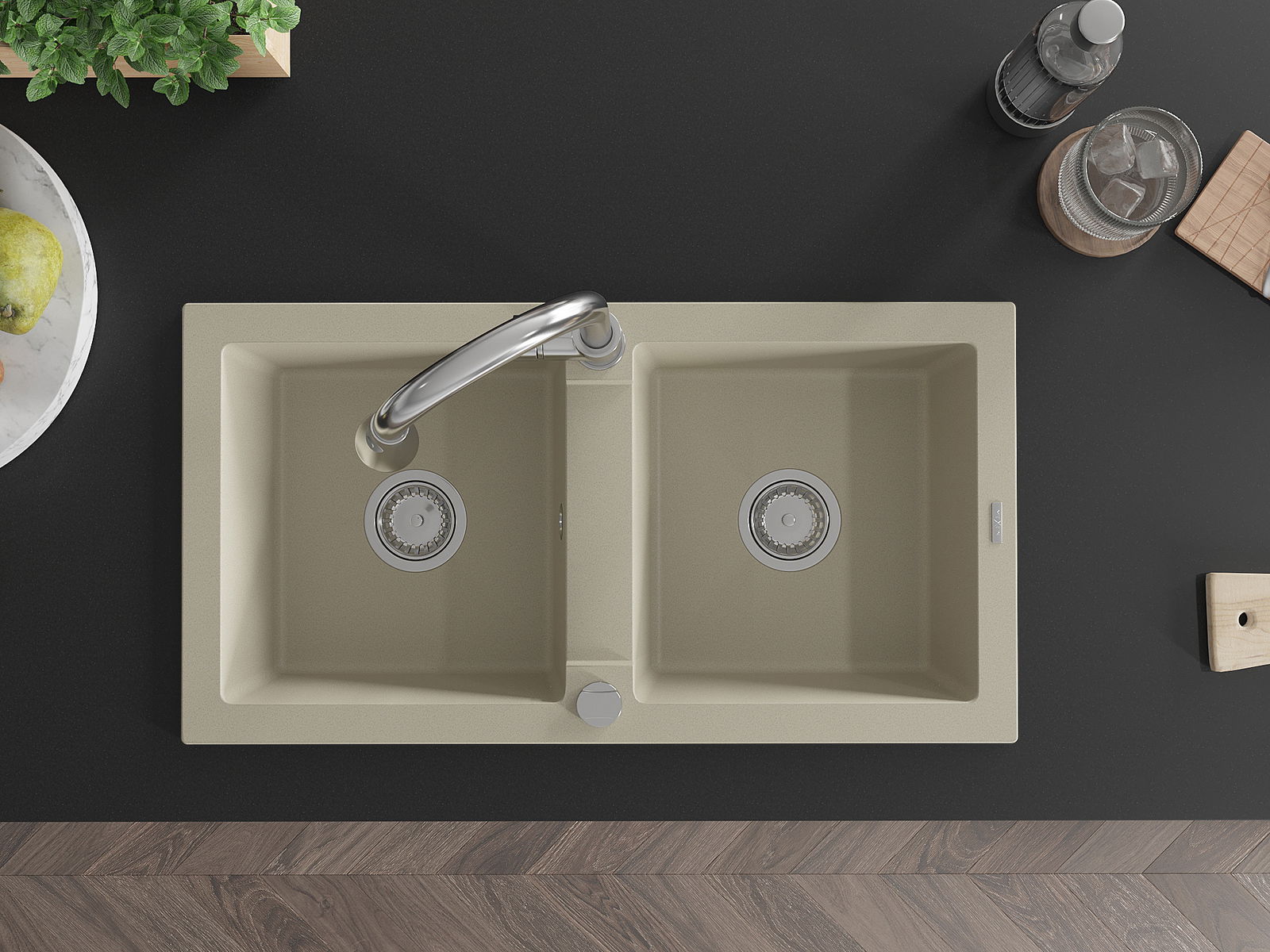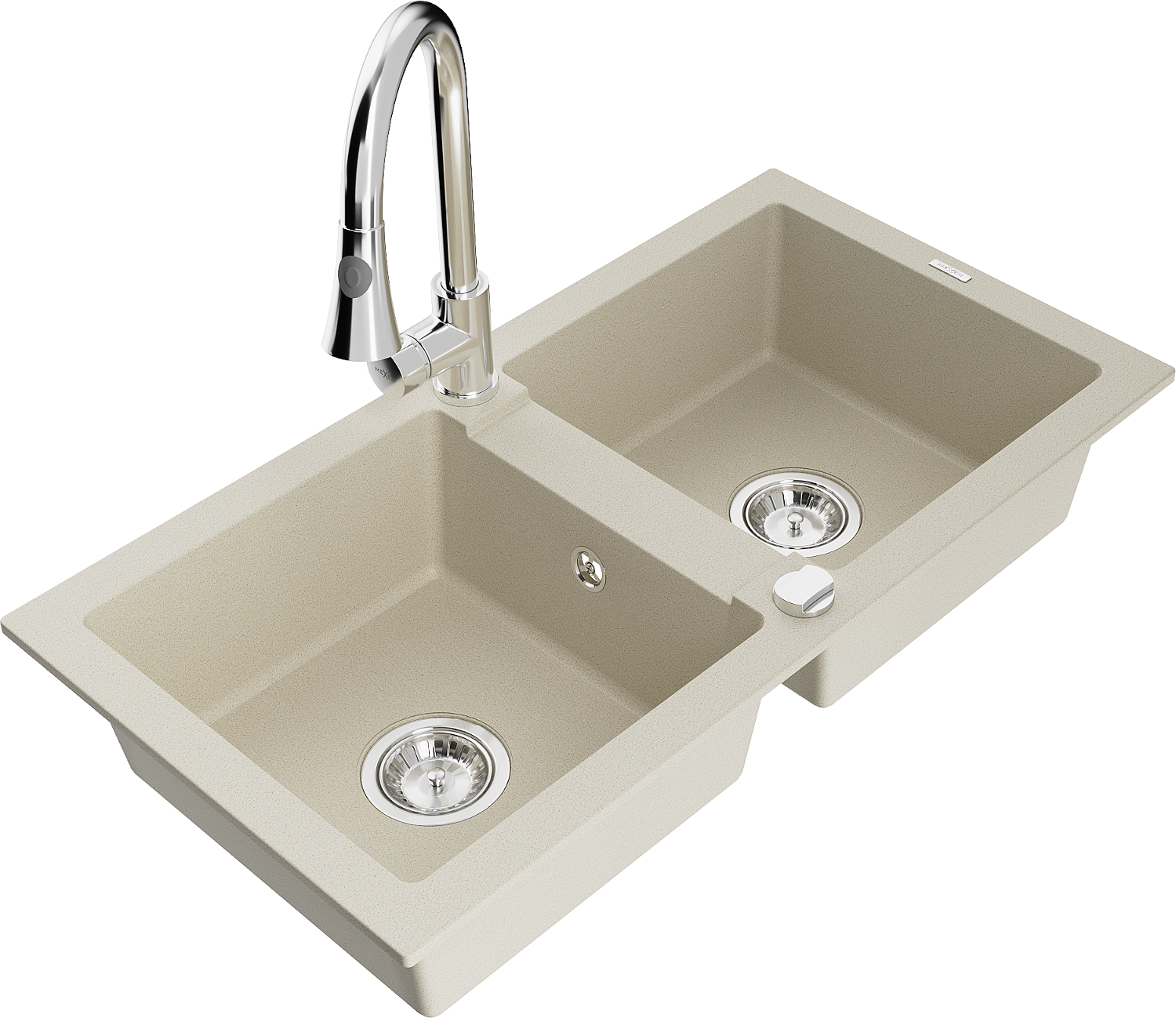 Mexen Mario kuchynský drez žulový 2-komorový s kuchynskou batériou Elia, béžový - 6504-69-670101-00