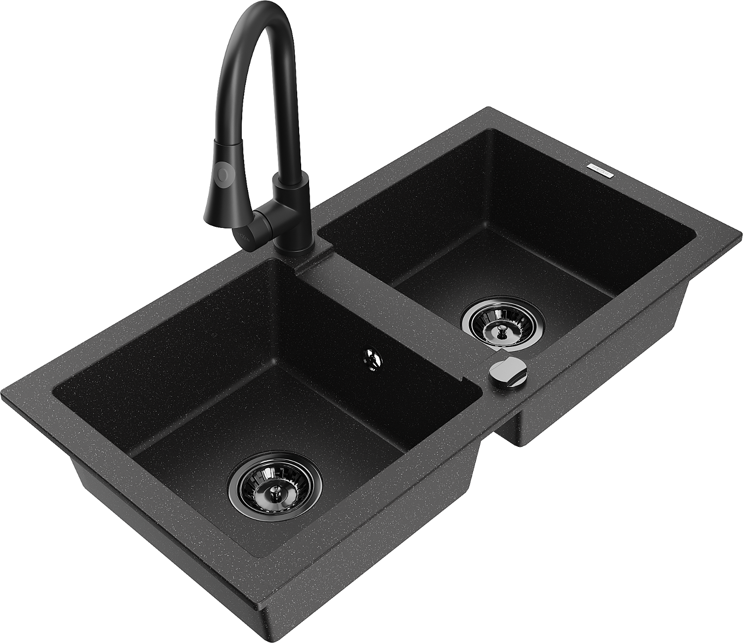 Mexen Mario granitový drez s 2 komorami s kuchynskou batériou Elia, čierny/strieborný metalik - 6504-73-670101-70-B