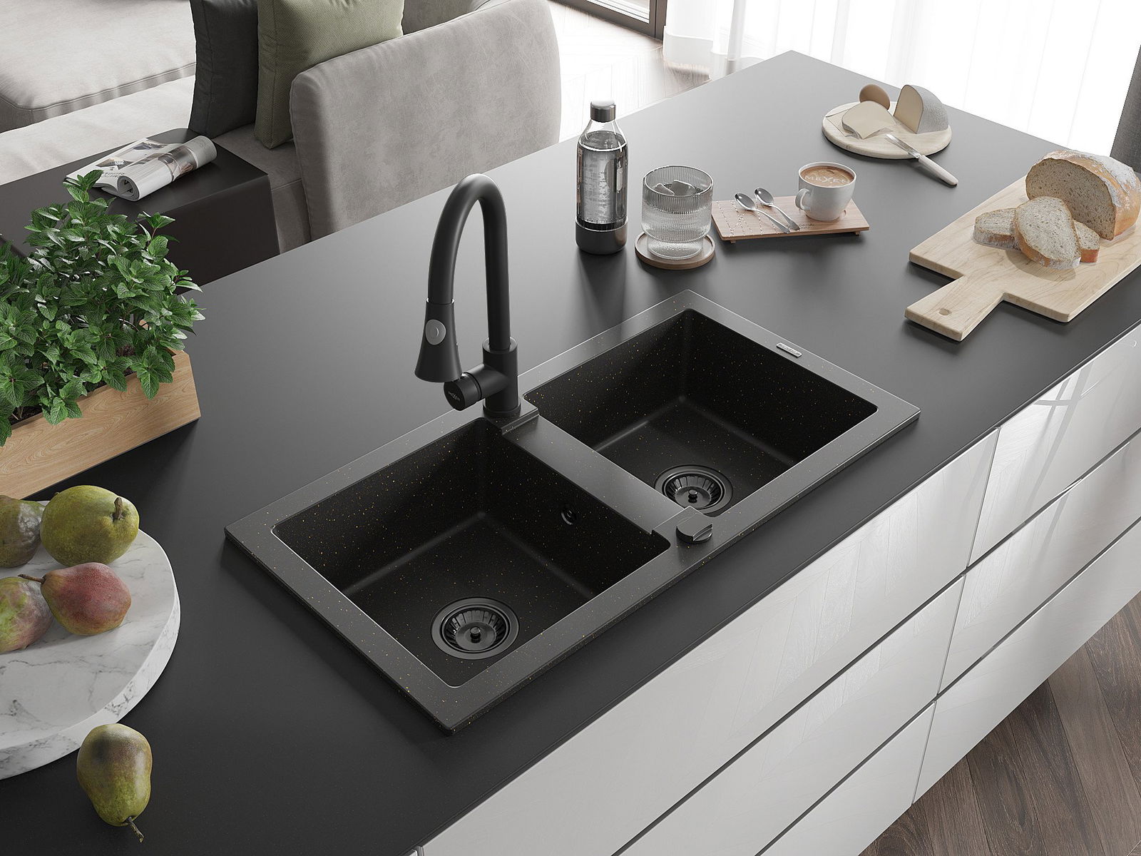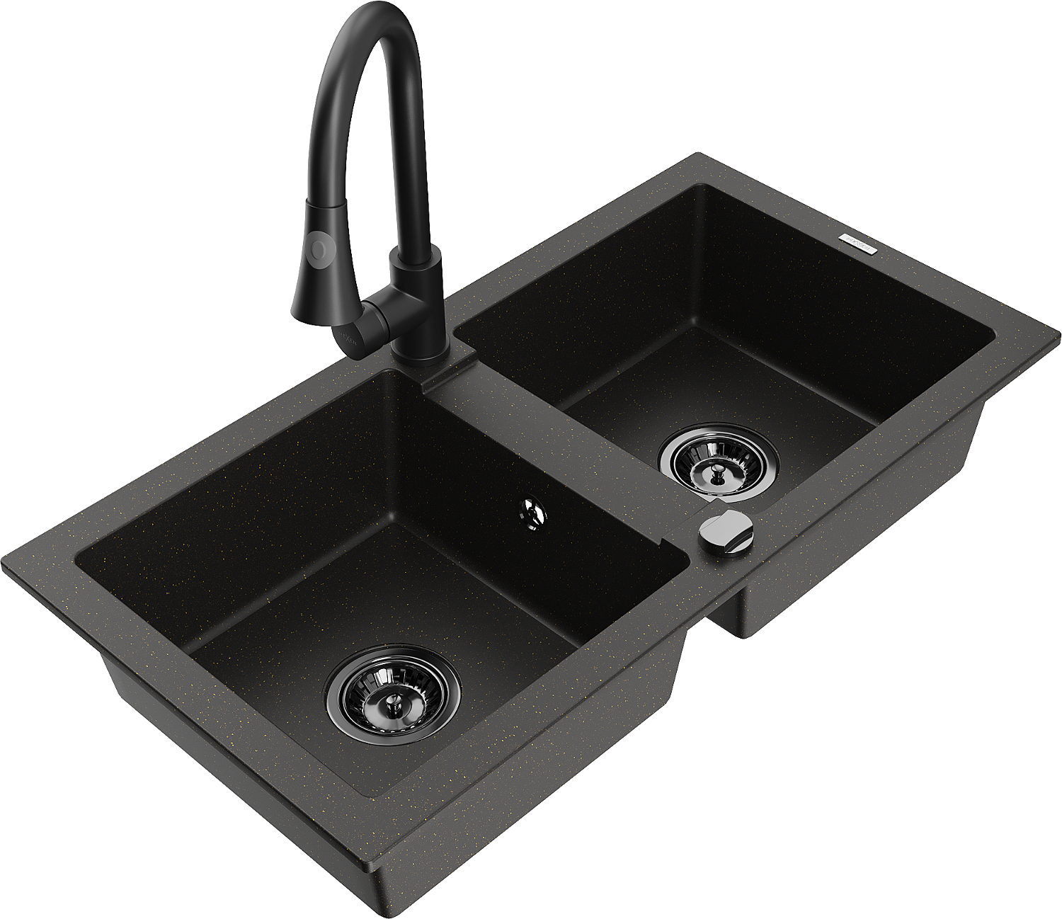 Mexen Mario žulový dvojkomorový kuchynský drez s batériou Elia, čierny/zlatý metalický - 6504-75-670101-70-B