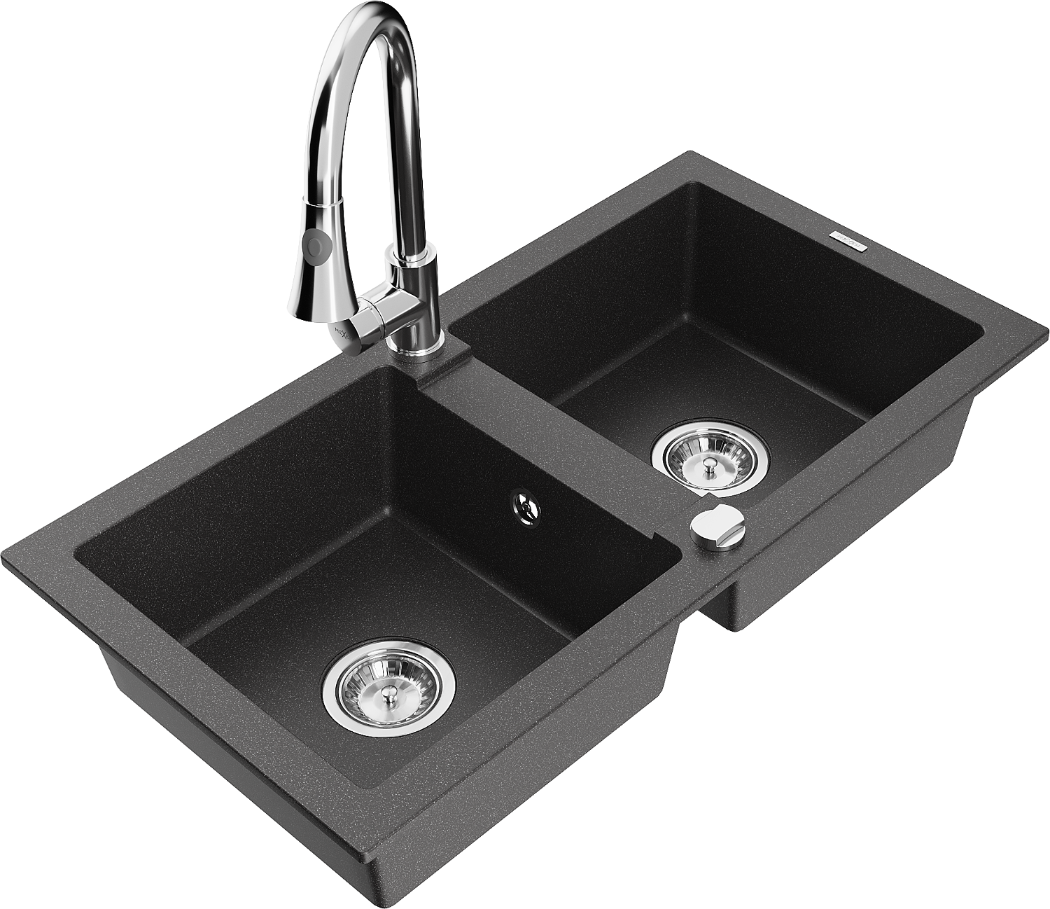 Mexen Mario žulový kuchynský drez 2-komorový s kuchynskou batériou Elia, čierny škvrnitý - 6504-76-670101-00