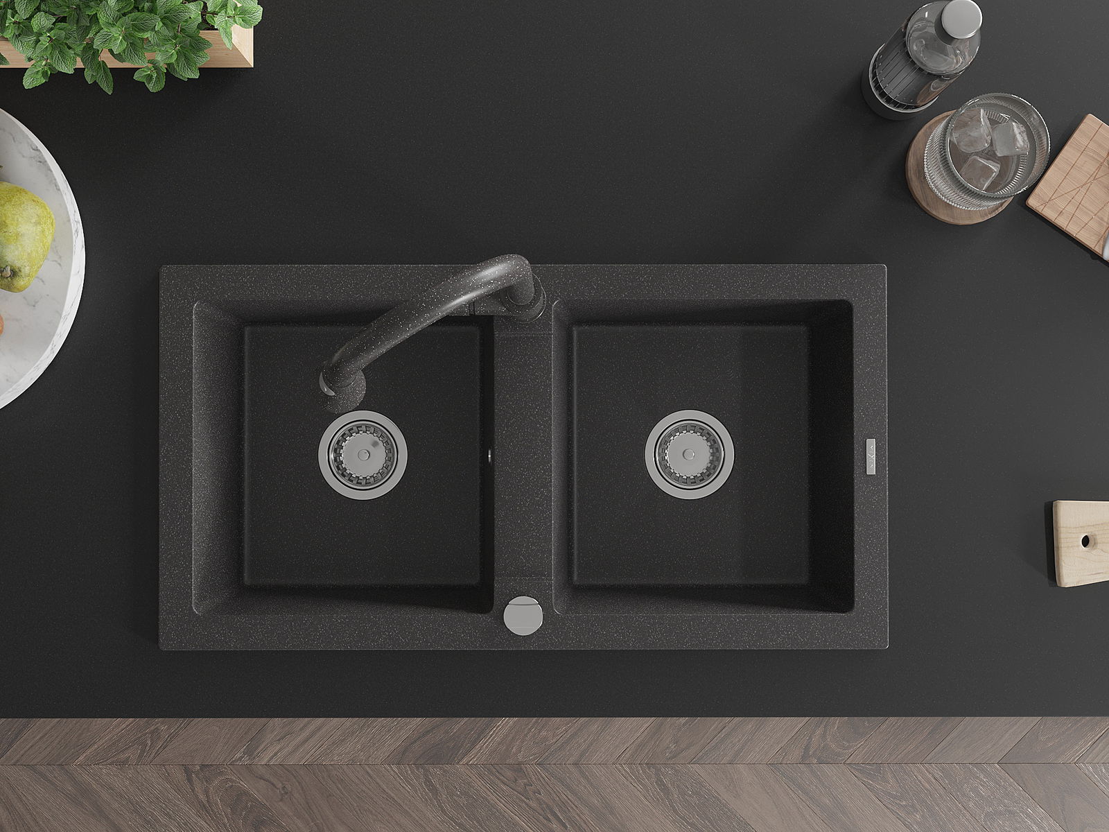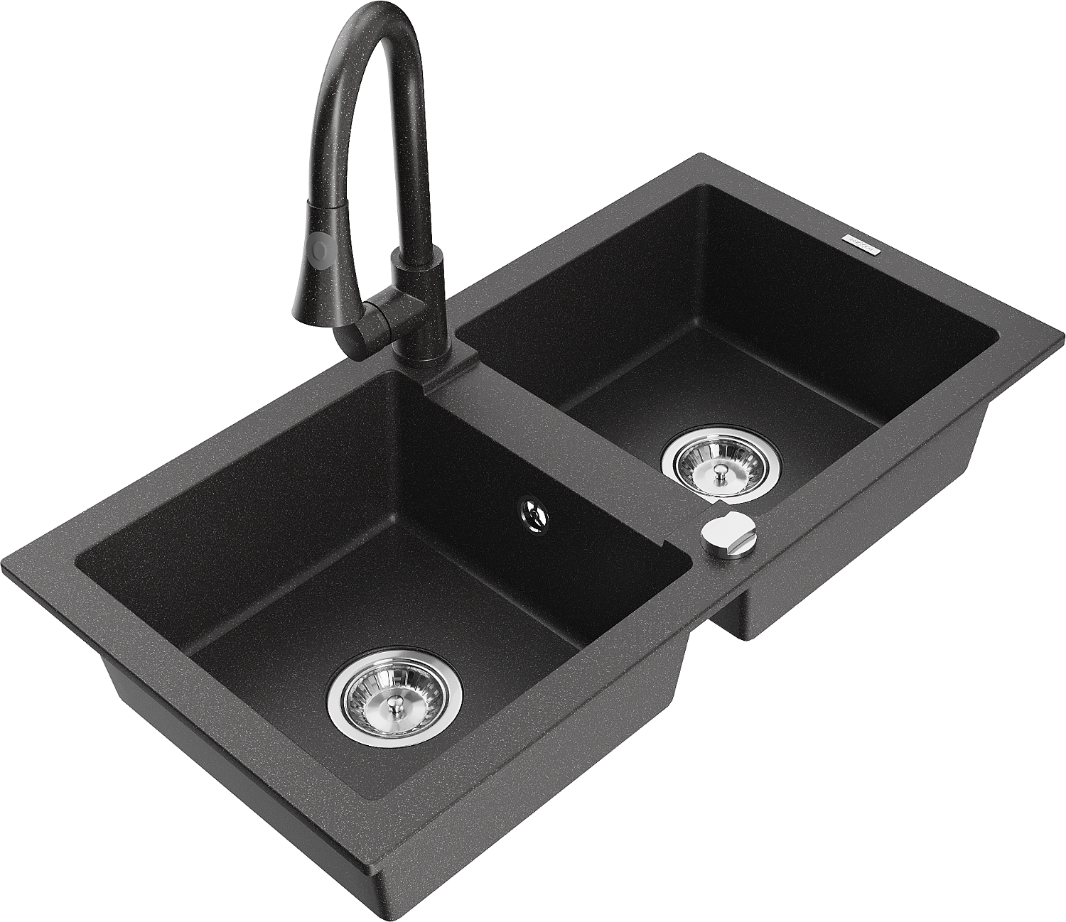 Mexen Mario žulový drez s 2 komorami a kuchynskou batériou Elia, čierny škvrnitý - 6504-76-670101-76