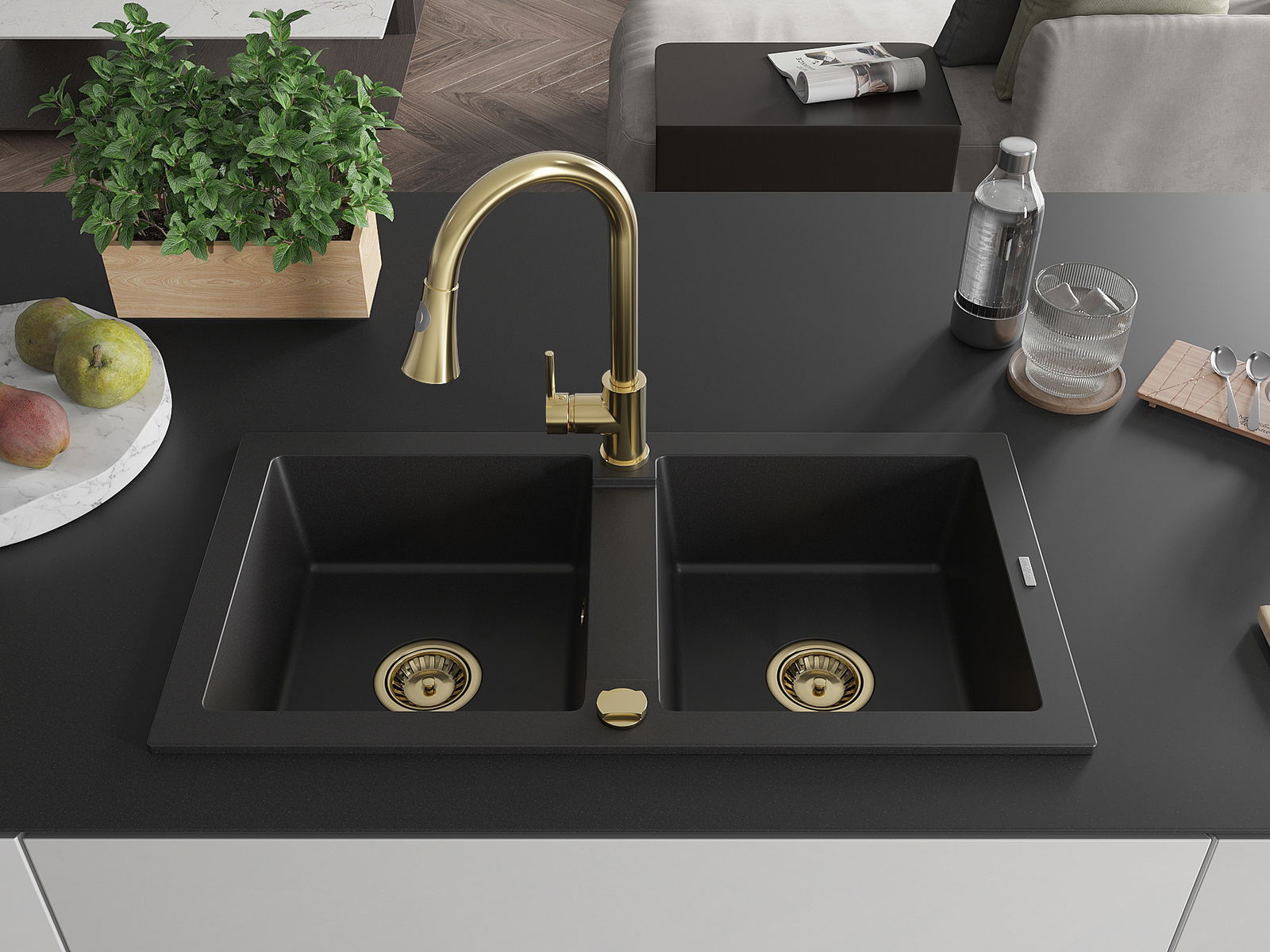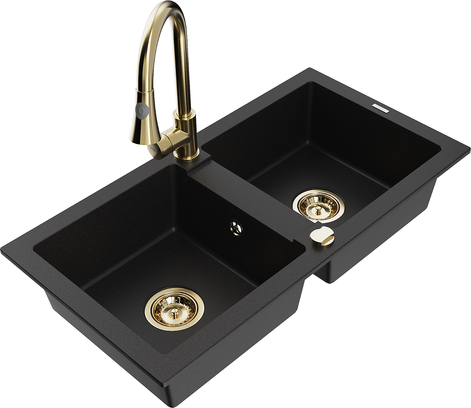 Mexen Mario dvojkomorový granitový drez s kuchynskou batériou Elia, čierny - 6504-77-670101-50