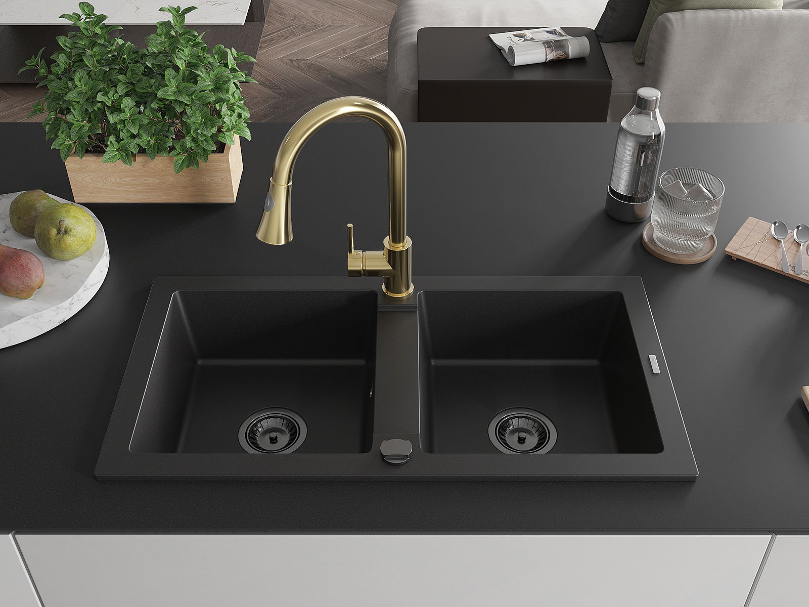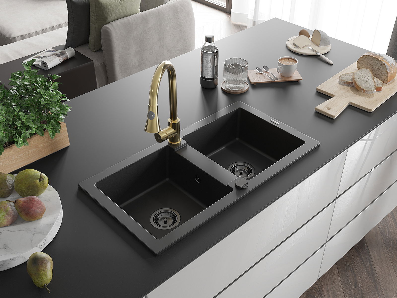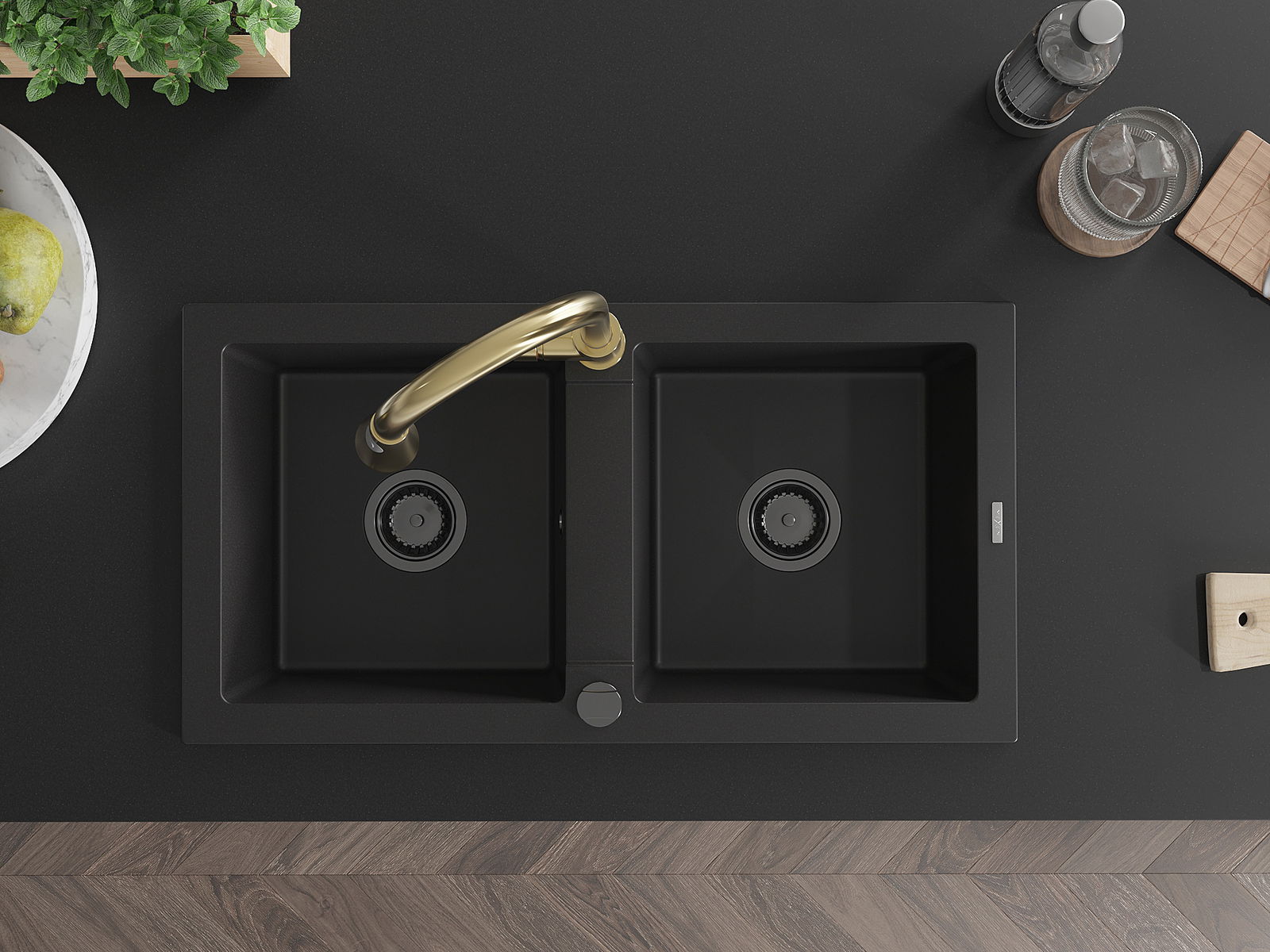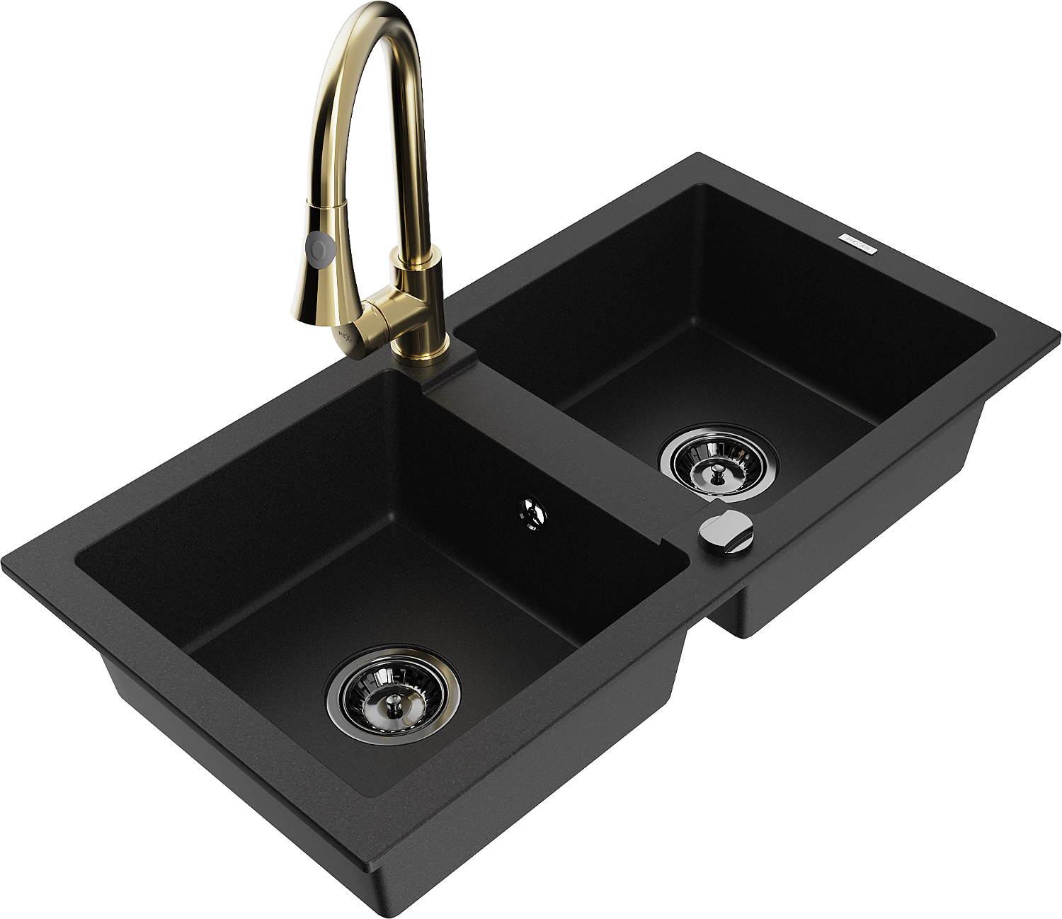 Mexen Mario dvojkomorový žulový drez s kuchynskou batériou Elia, čierny - 6504-77-670101-50-B