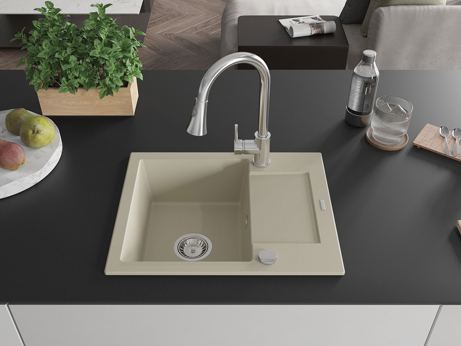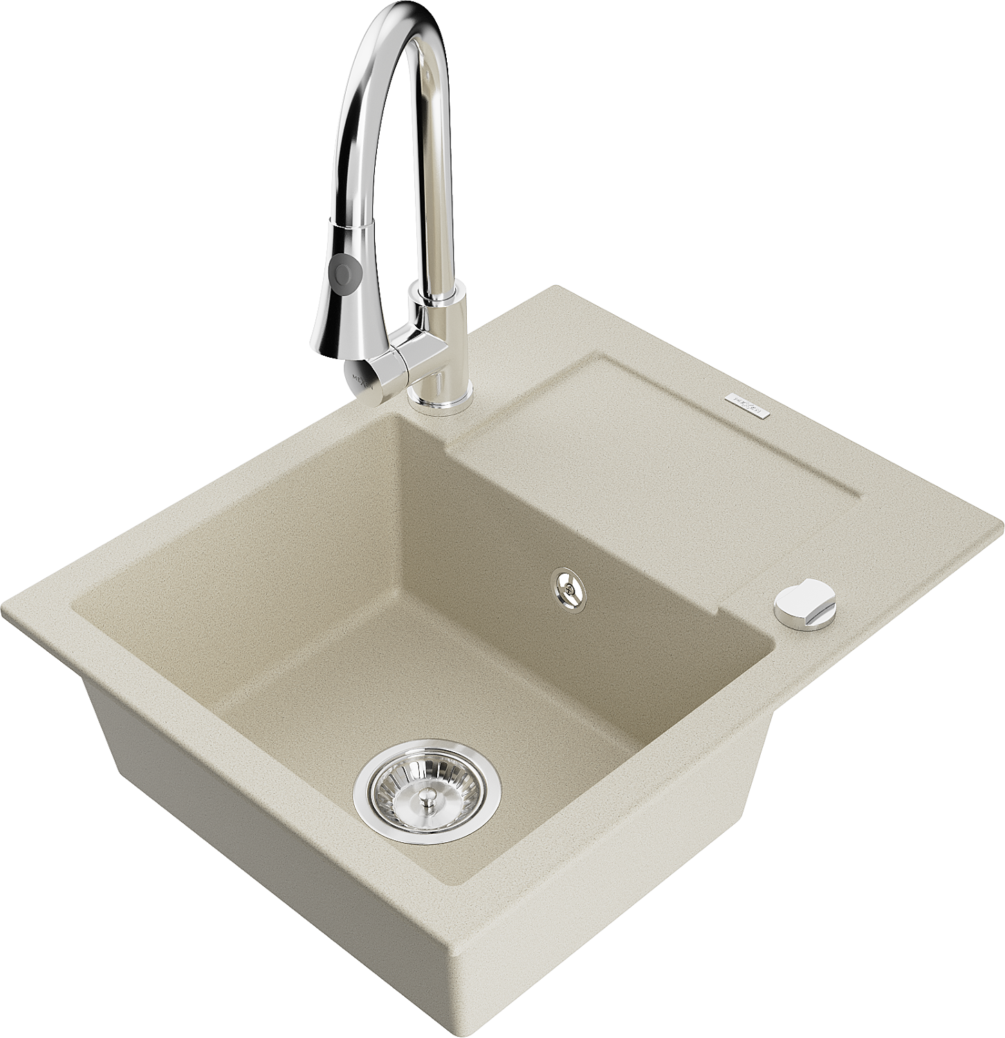 Mexen Enzo granitový drez 1-komorový so odkvapkávacou plochou a kuchynskou batériou Elia, béžový - 6506-69-670101-00