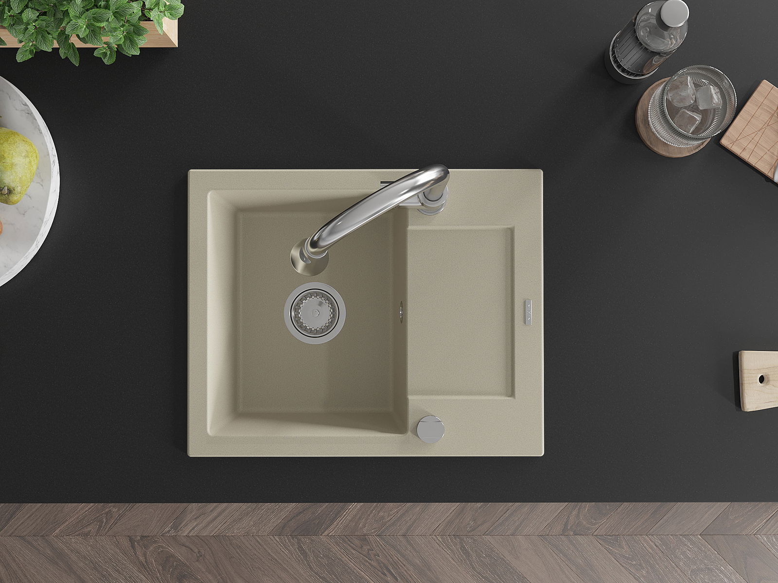 Povrch kuchynského drezu je odolný voči škvrnám a zafarbeniu, vďaka čomu sa ľahko udržiava a zachováva svoju farbu počas dlhého obdobia používania. Estetický a praktický doplnok pre každú kuchyňu.