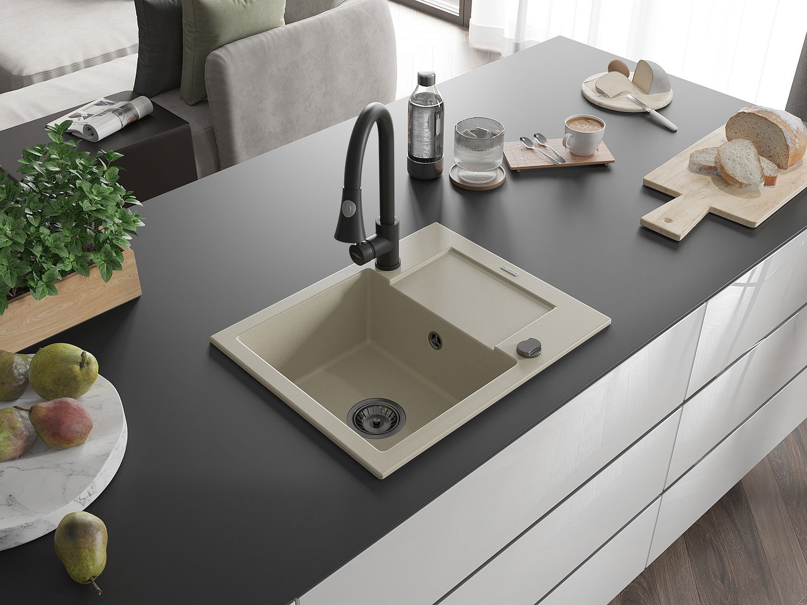 Povrch umývadla je odolný voči škvrnám a sfarbeniu, vďaka čomu sa ľahko čistí a zachováva si svoju farbu po dlhú dobu. Estetický a prakticky dopĺňajúci každú kuchyňu.