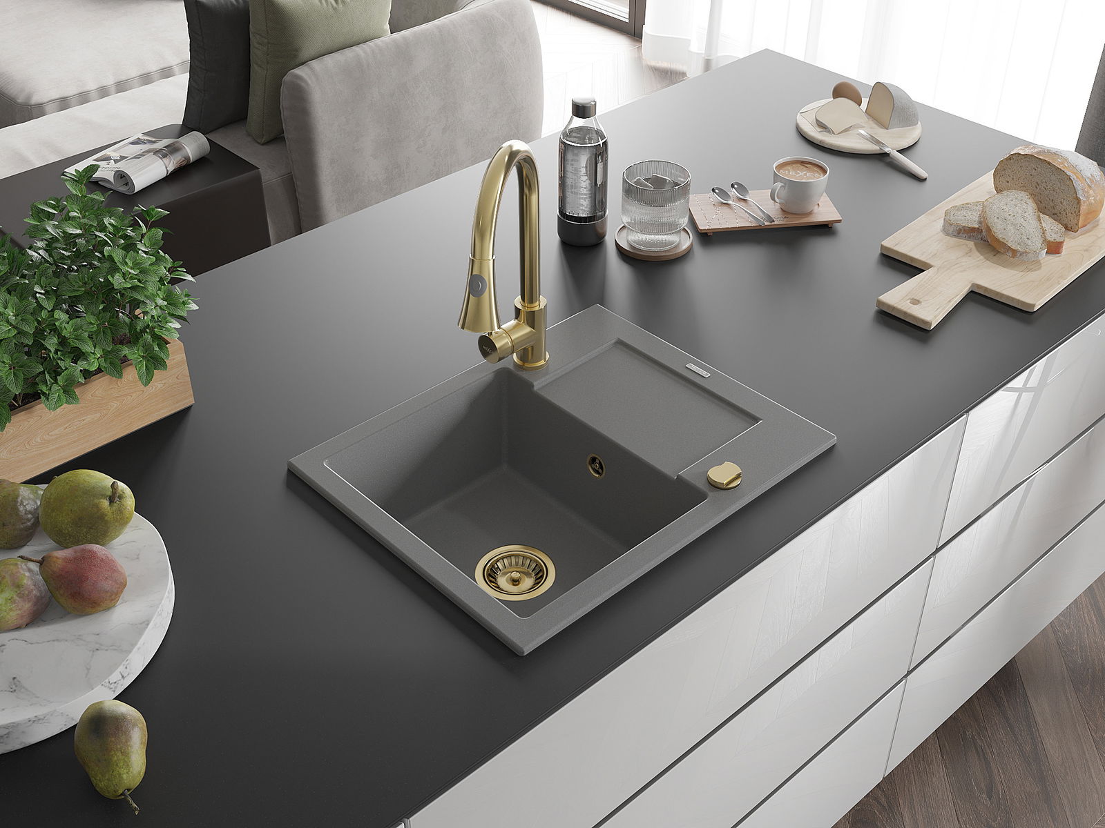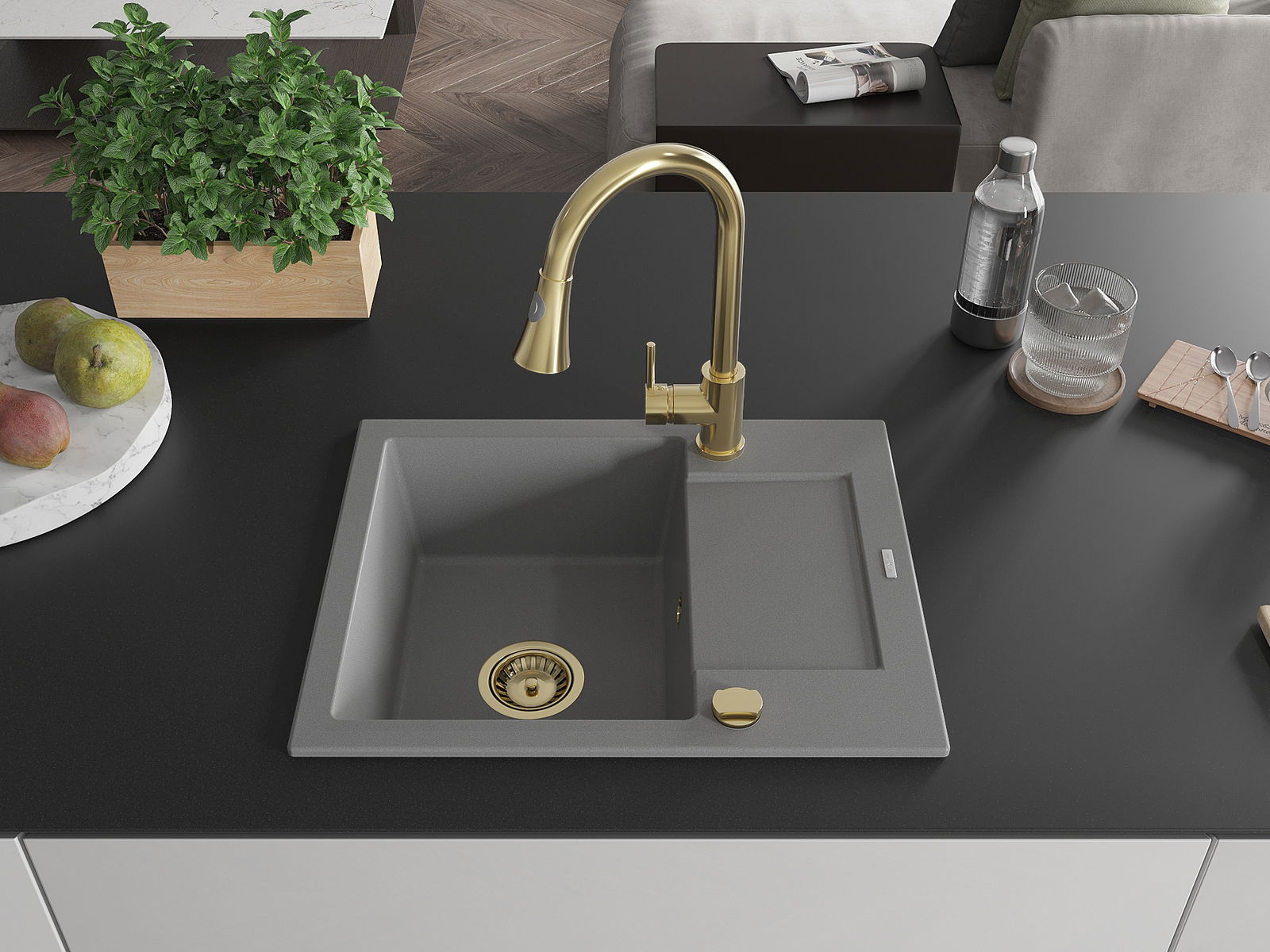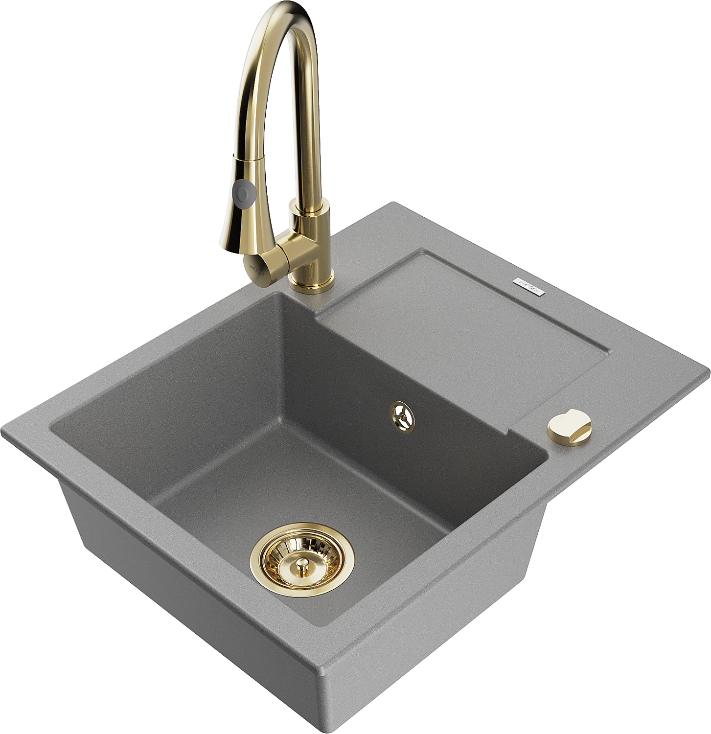 Mexen Enzo kuchynský drez z granitu 1-komorový s odkvapom a kuchynskou batériou Elia, sivý - 6506-71-670101-50