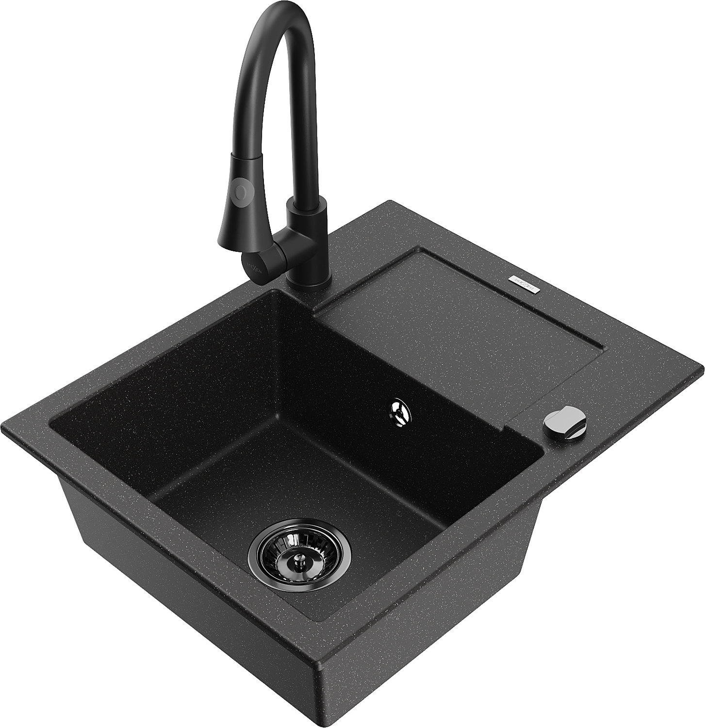 Mexen Enzo Granitový jednokomorový drez s odkvapkávačom a kuchynskou batériou Elia, čierny/strieborný metalik