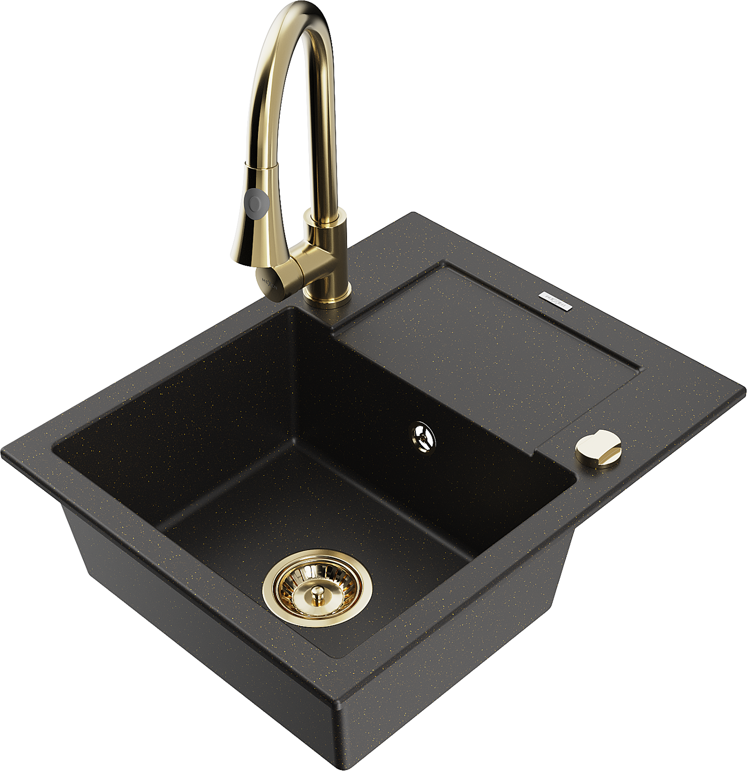Mexen Enzo granitový drez s 1 komorou, s odkvapkávačom a kuchynskou batériou Elia, čierny/zlatý metalický - 6506-75-670101-50