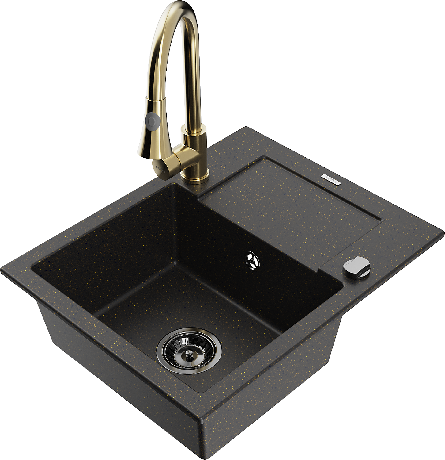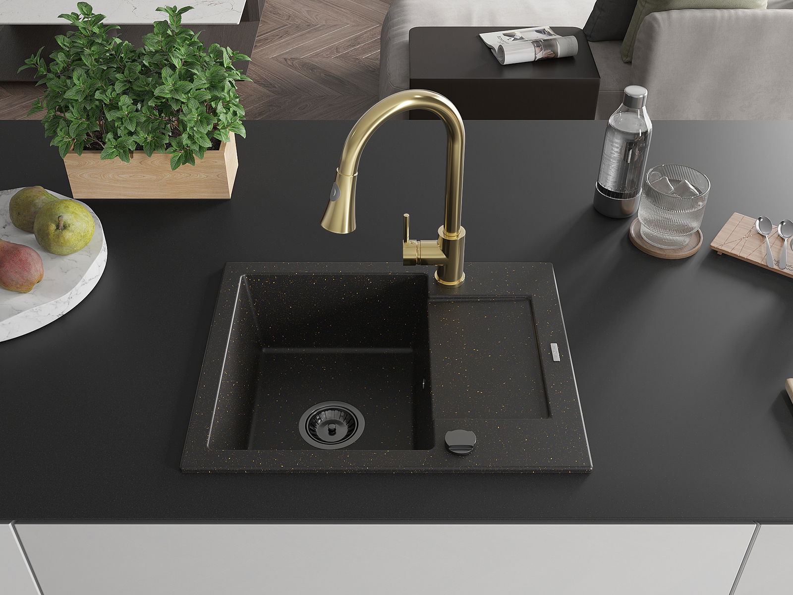 Mexen Enzo granitový drez 1-komorový s odkvapkávačom a kuchynskou batériou Elia, čierny/zlatý metalik - 6506-75-670101-50-B