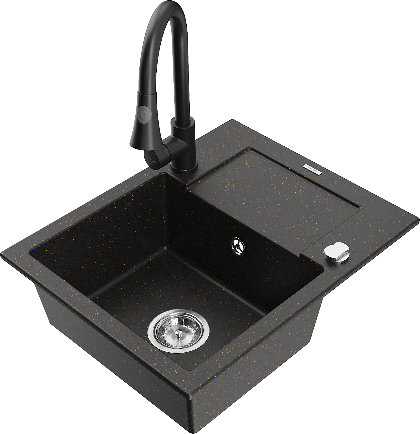 Mexen Enzo granitový drez s 1 komorou s odkvapkávačom a kuchynskou batériou Elia, čierny/zlatý metalik - 6506-75-670101-70