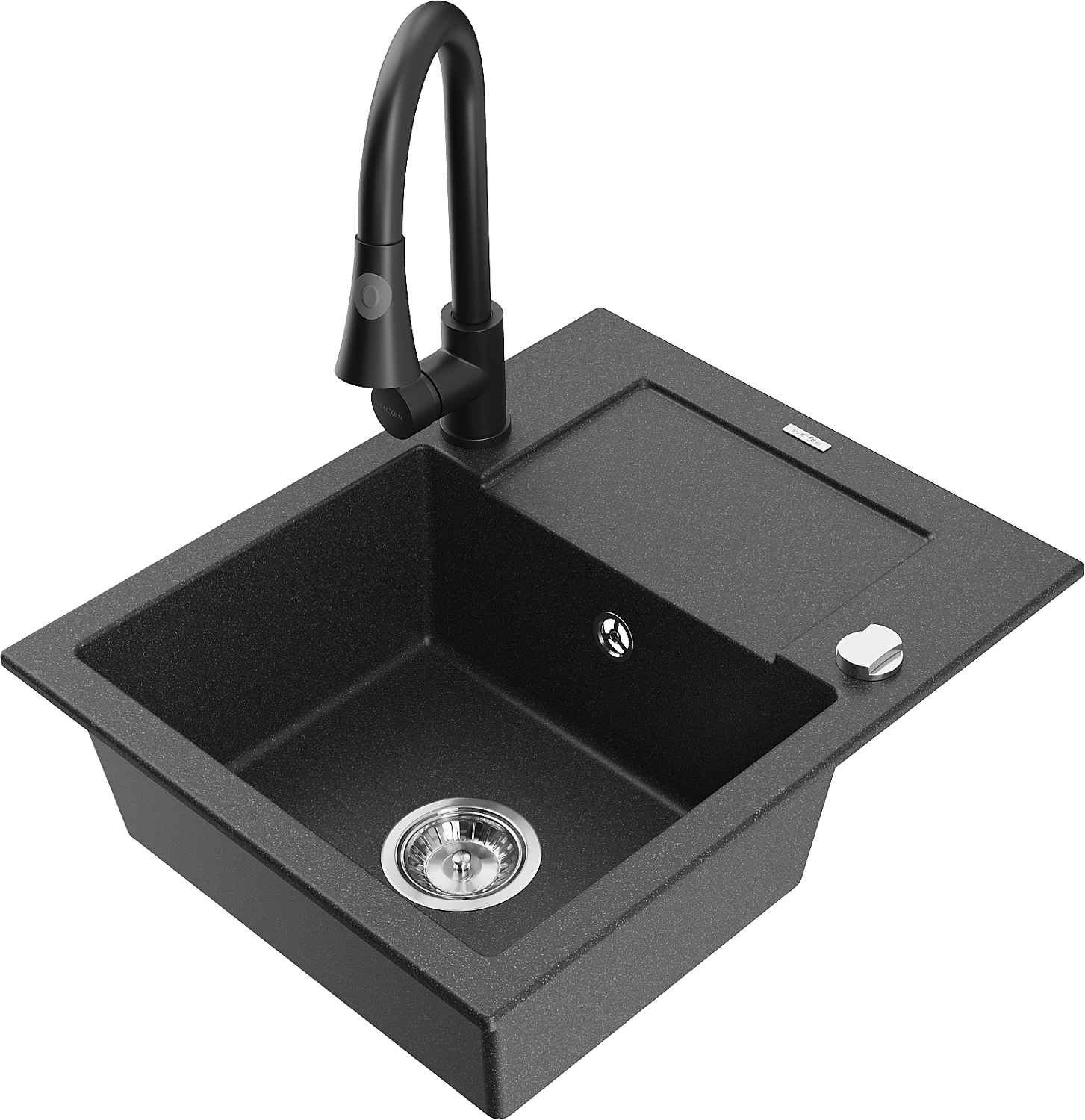 Mexen Enzo žulový kuchynský drez s 1 komorou, odkvapkávačom a kuchynskou batériou Elia, čierny škvrnitý - 6506-76-670101-70
