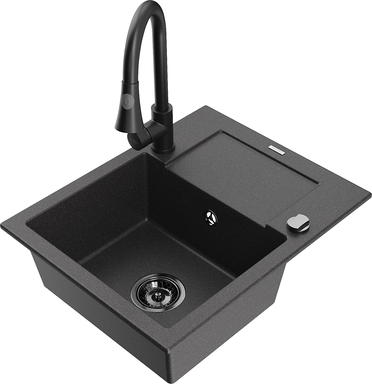Mexen Enzo granitový drez s 1-komorou s odkvapom a kuchynskou batériou Elia, čierny bodkovaný - 6506-76-670101-70-B