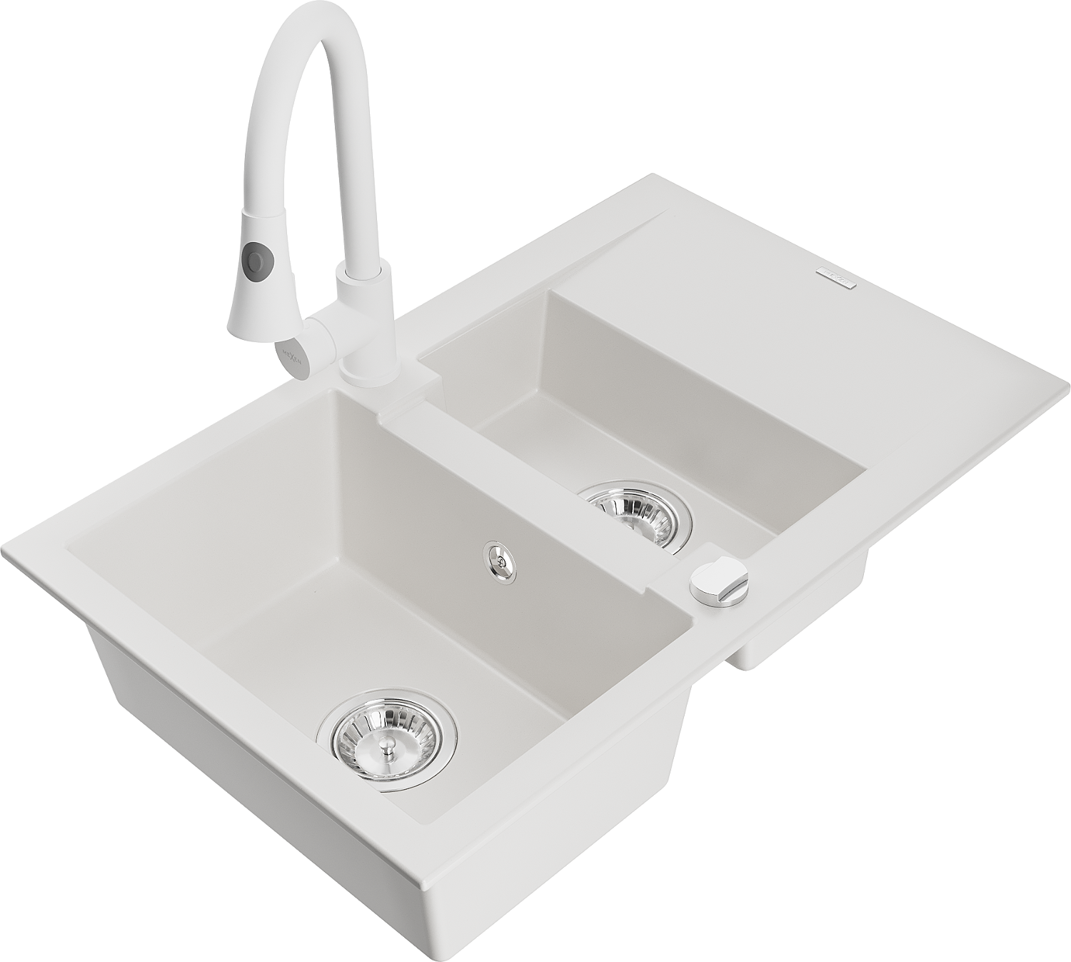 Mexen Gaspar granitový drez 1,5-komorový s odkvapkávačom a kuchynskou batériou Elia, biely - 6507-20-670101-20