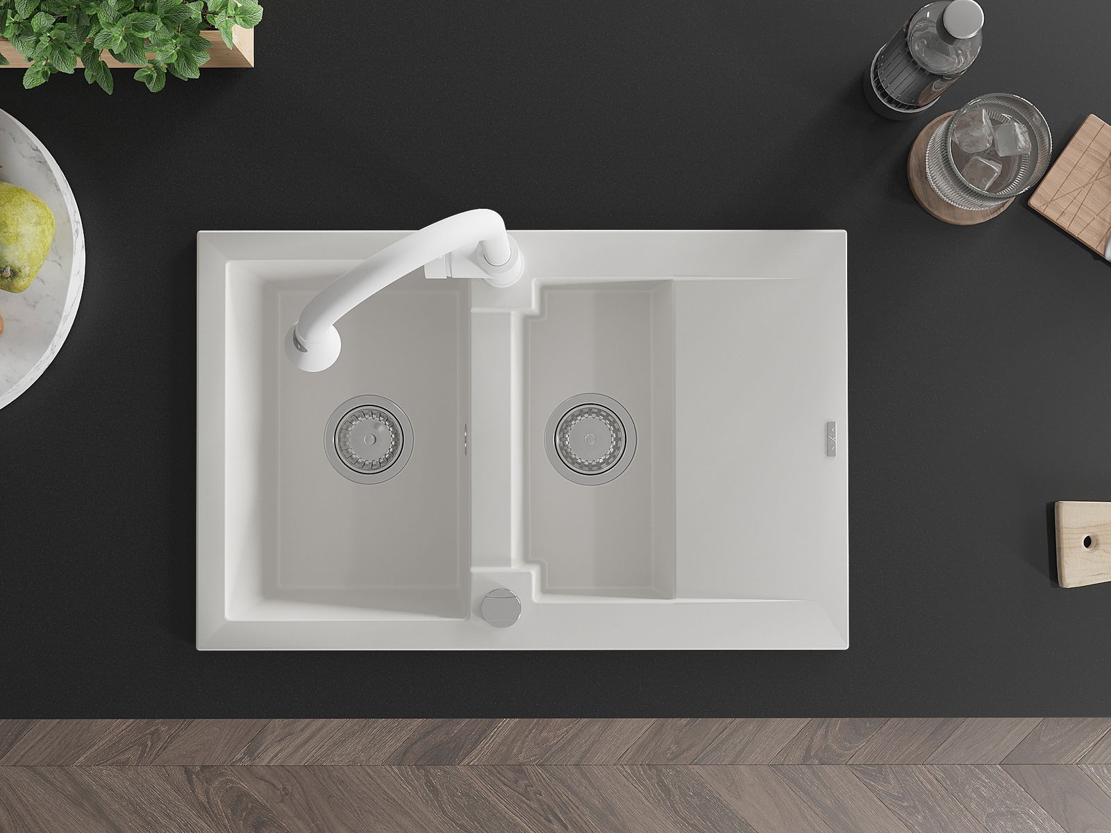 Povrch umývadla je odolný voči škvrnám a sfarbeniu, vďaka čomu sa ľahko čistí a zachováva si svoju farbu po dlhú dobu. Estetický a prakticky dopĺňajúci každú kuchyňu.