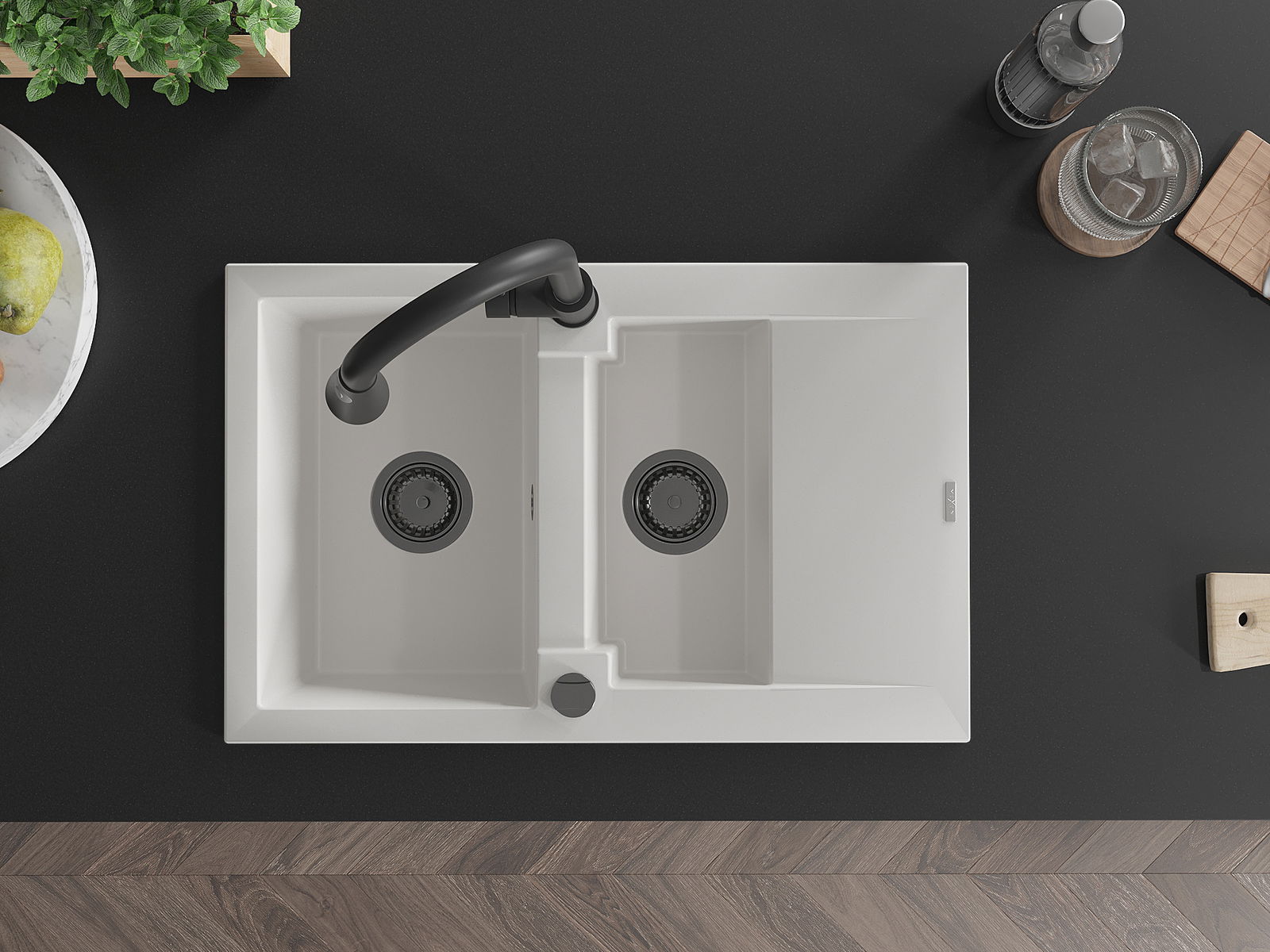 Mexen Gaspar žulový kuchynský drez 1,5-komorový s odkvapkávačom a kuchynskou batériou Elia, biela - 6507-20-670101-70