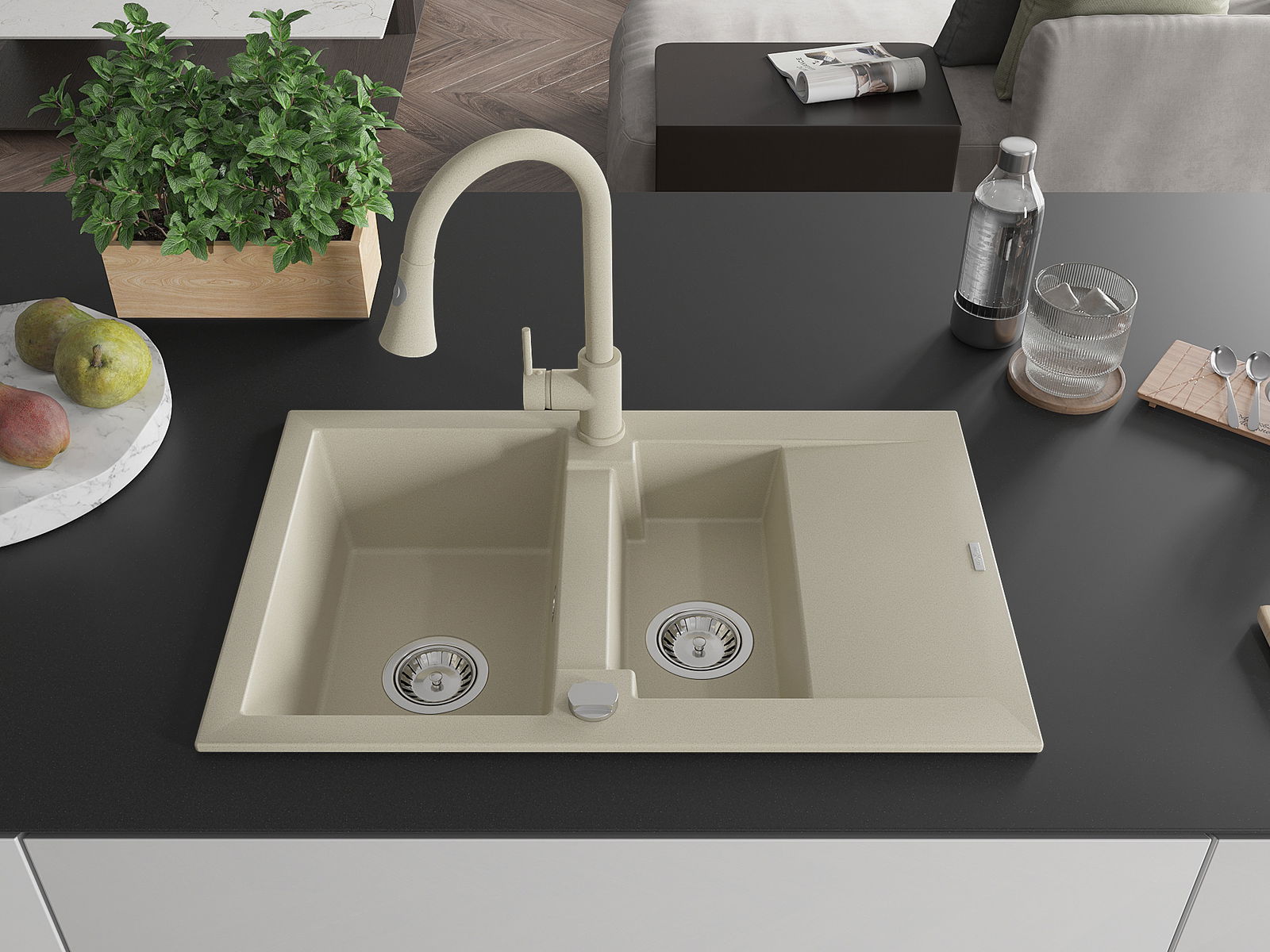 Povrch umývadla je odolný voči škvrnám a sfarbeniu, vďaka čomu sa ľahko čistí a zachováva si svoju farbu po dlhú dobu. Estetický a prakticky dopĺňajúci každú kuchyňu.