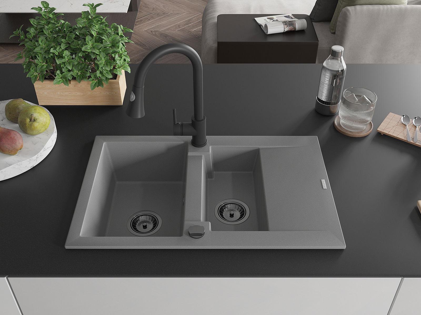 Mexen Gaspar granitový drez 1,5-komorový s odkvapkávačom a kuchynskou batériou Elia, šedý - 6507-71-670101-70-B