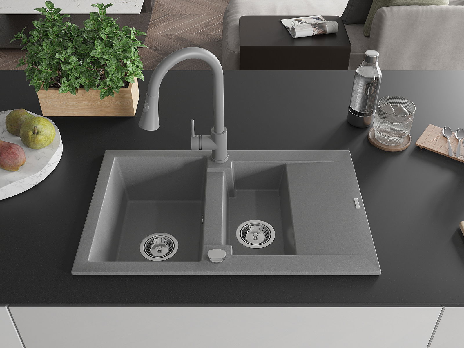 Povrch umývadla je odolný voči škvrnám a sfarbeniu, vďaka čomu sa ľahko čistí a zachováva si svoju farbu po dlhú dobu. Estetický a prakticky dopĺňajúci každú kuchyňu.