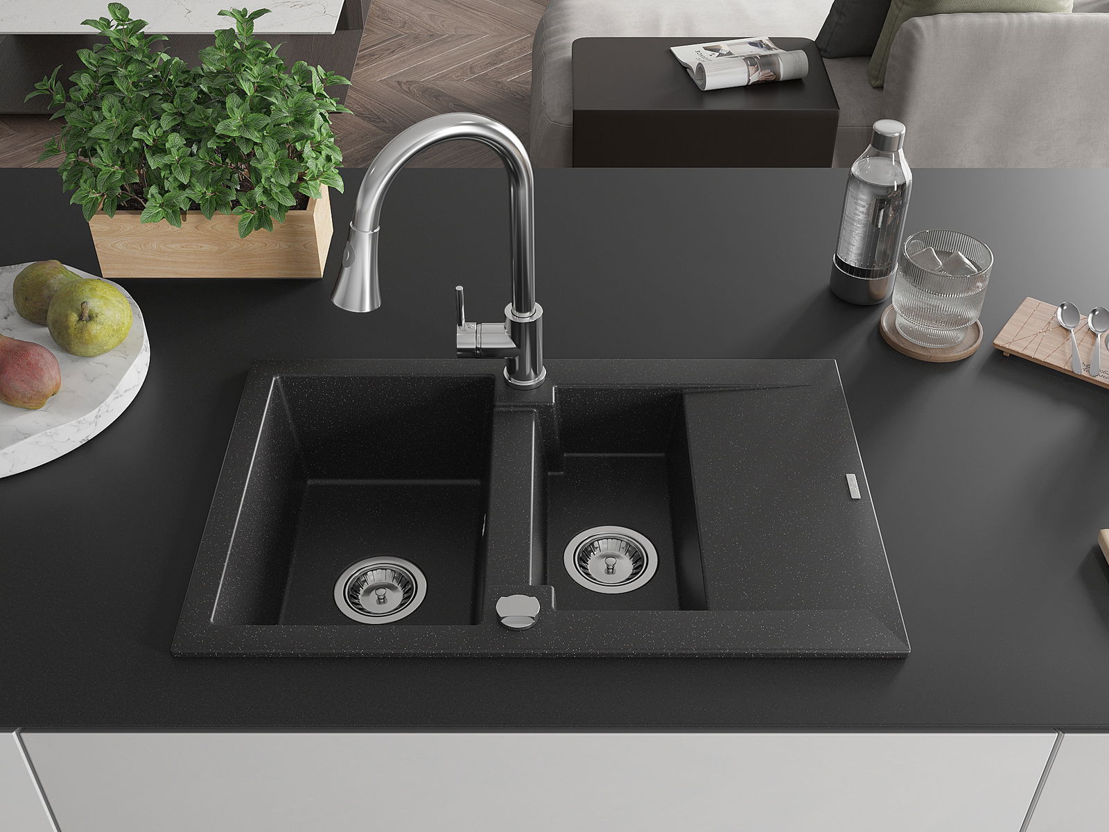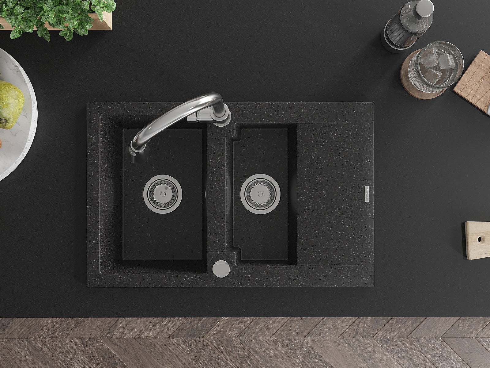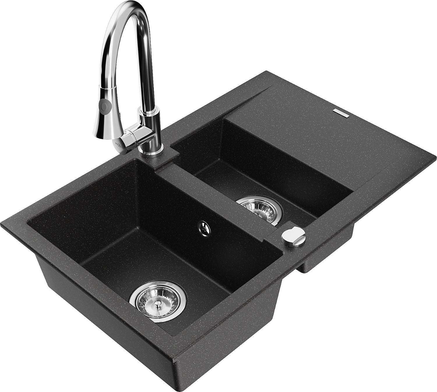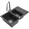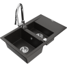 Mexen Gaspar granitový drez 1,5-komorový s odkvapkávačom a kuchynskou batériou Elia, čierny/strieborný metalik