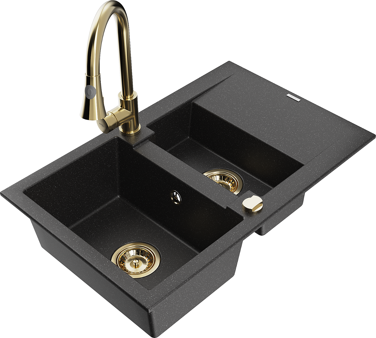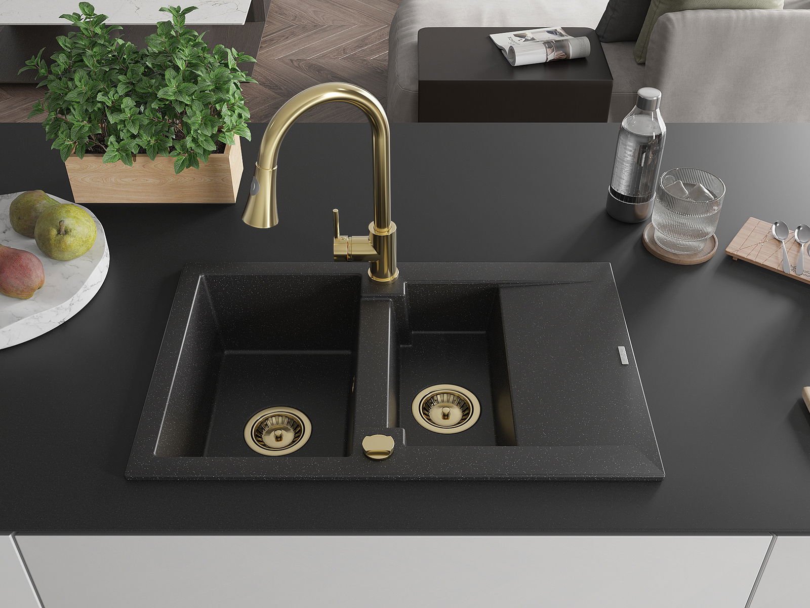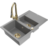 Mexen Gaspar žulový drez s 1,5 komorami s odkvapkávačom a kuchynskou batériou Elia, čierny/strieborný metalík