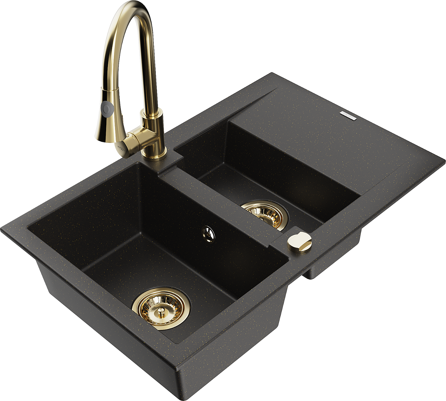 Mexen Gaspar granitový drez 1,5-komorový s odkvapkávačom a kuchynskou batériou Elia, čierny/zlatý metalický - 6507-75-670101-50