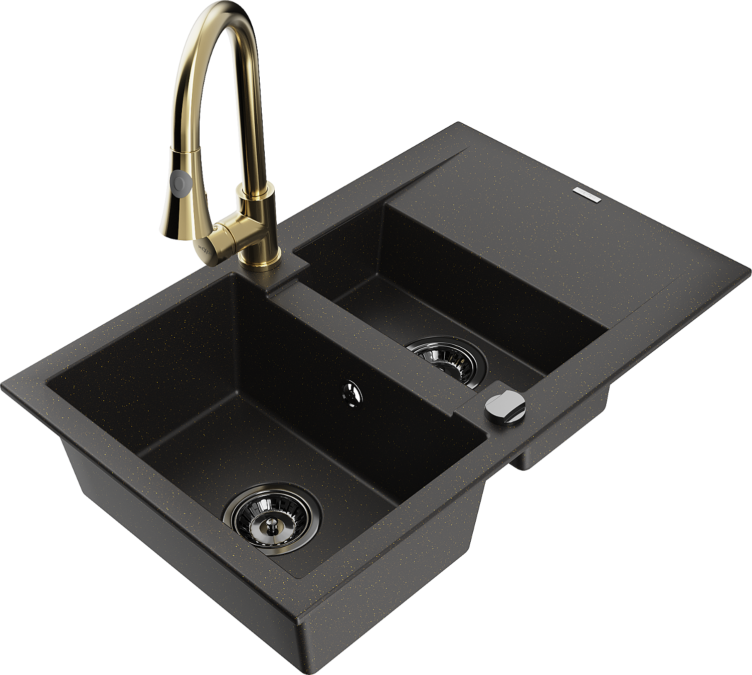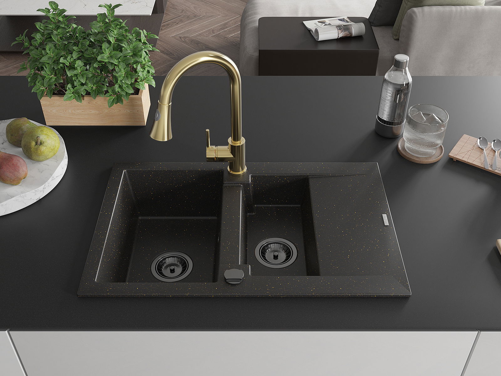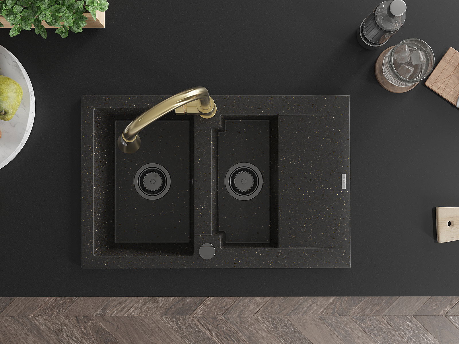Mexen Gaspar granitový drez 1,5-komorový s odkvapkávačom a kuchynskou batériou Elia, čierny/zlatý metalík
