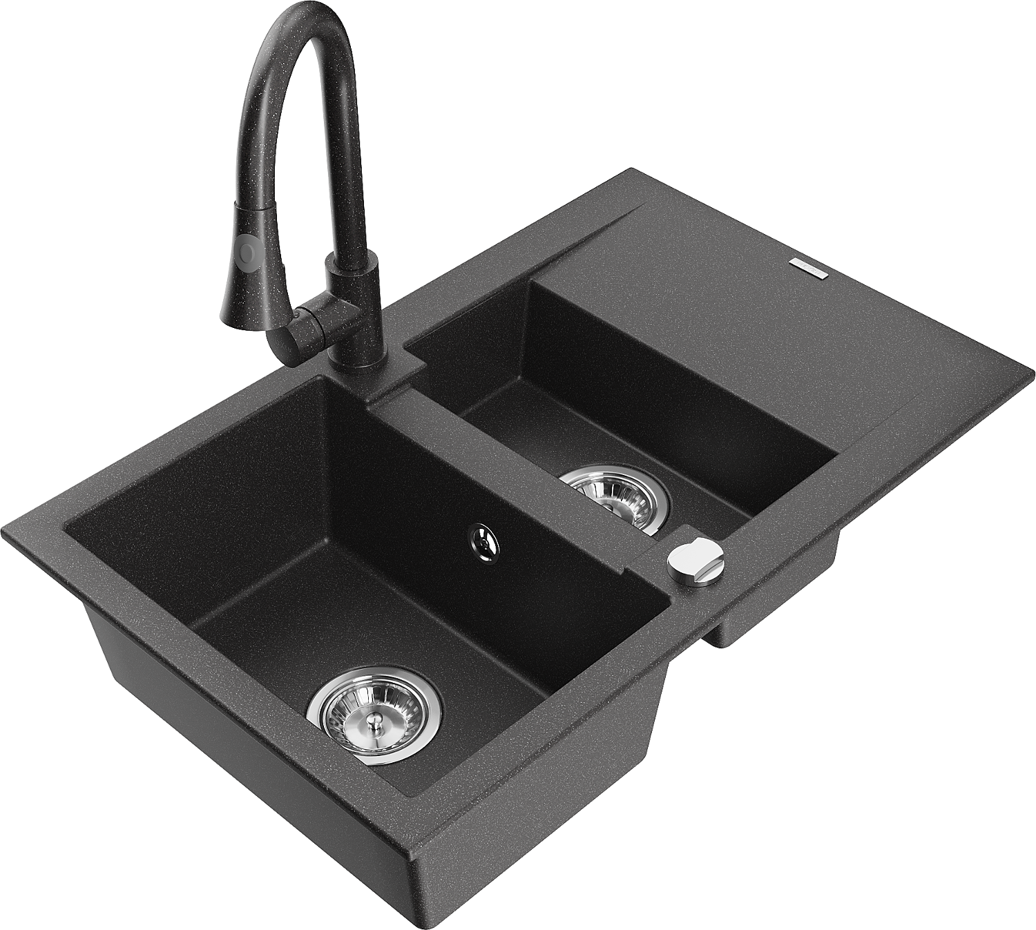 Mexen Gaspar žulový drez 1,5-komorový s odkvapkávačom a kuchynskou batériou Elia, čierny škvrnitý - 6507-76-670101-76