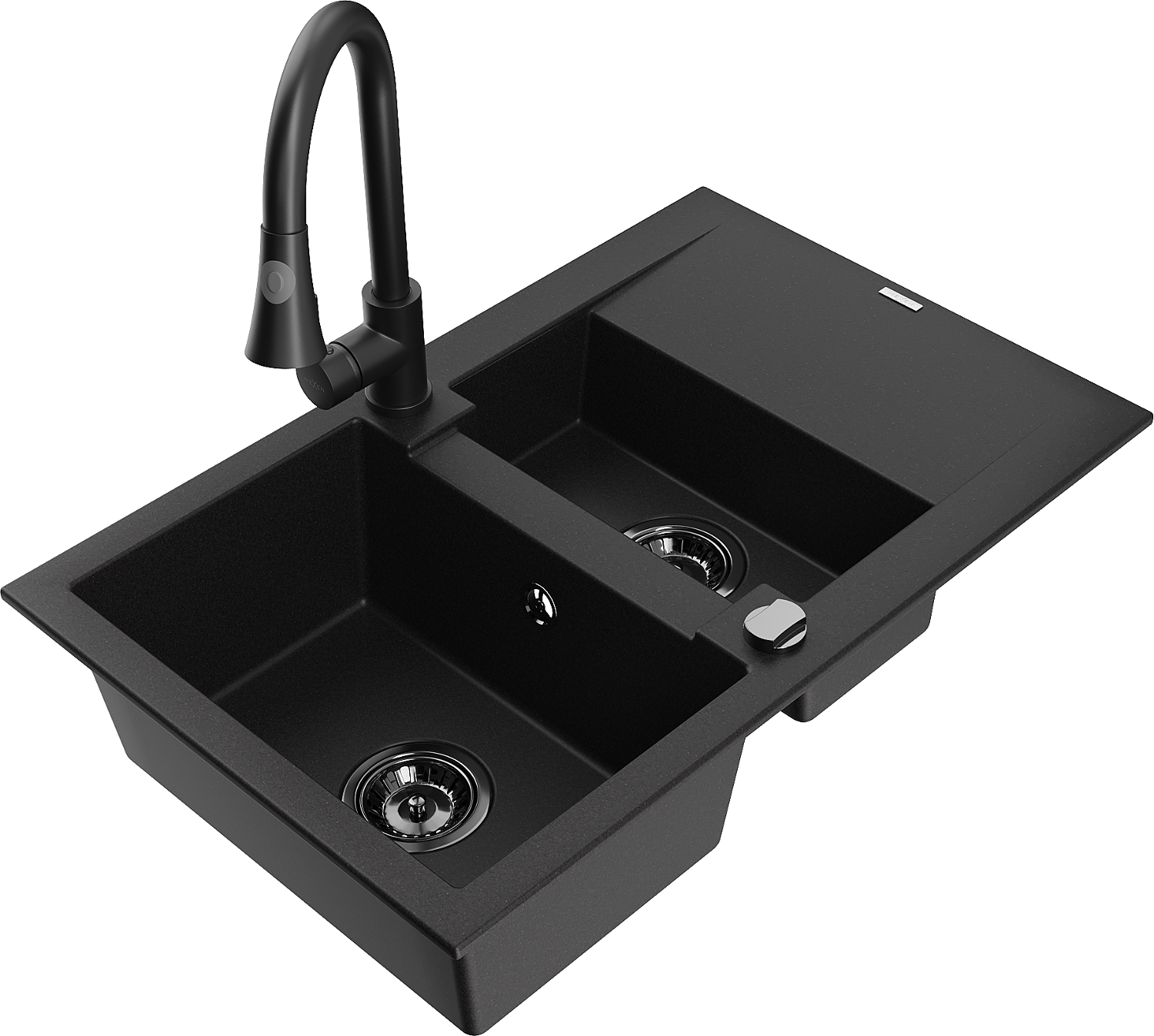 Mexen Gaspar žulový kuchynský drez 1,5-komorový s odkvapkávačom a kuchynskou batériou Elia, čierny - 6507-77-670101-70-B
