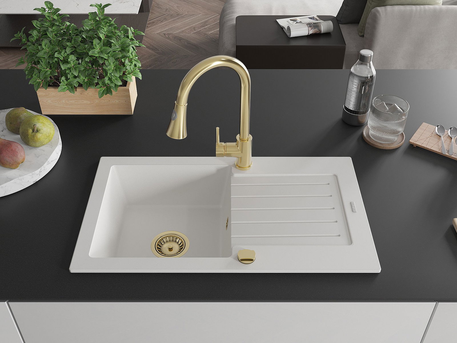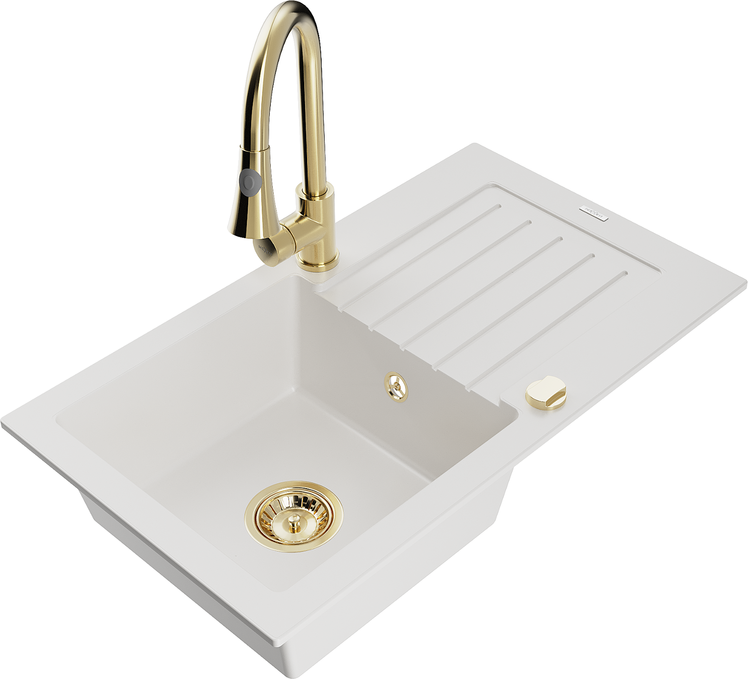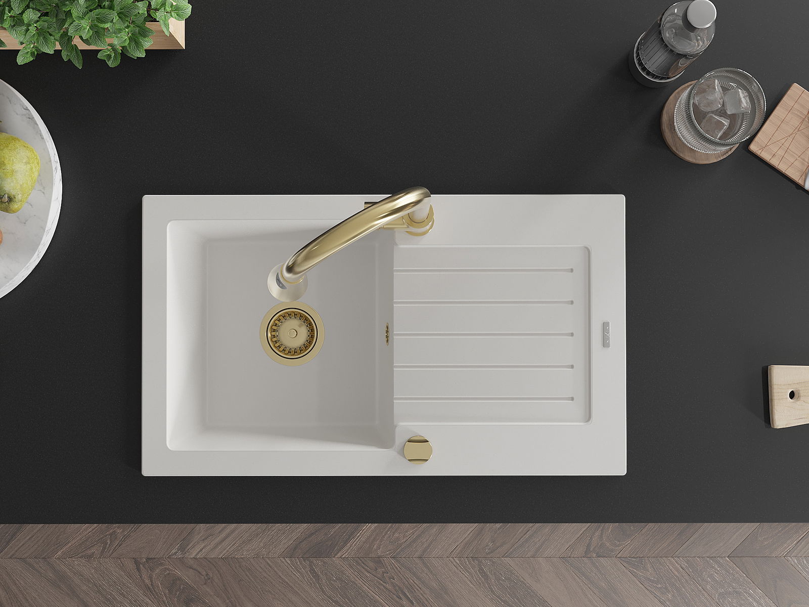 Mexen Pablo granitový drez s odkvapkávačom a kuchynskou batériou Elia, biely - 6510-20-670101-50