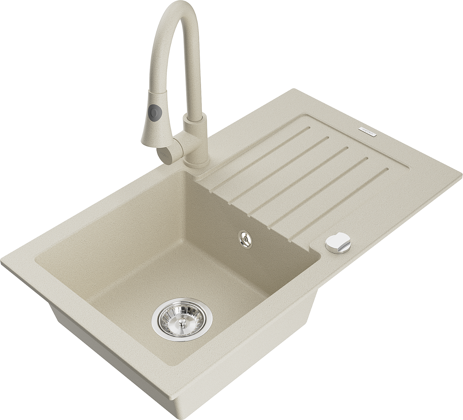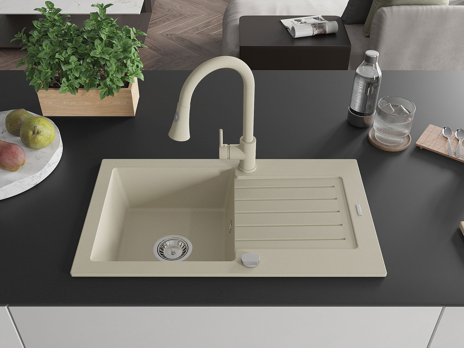 Mexen Pablo žulový drez s 1 komorou a odkvapkávačom a kuchynskou batériou Elia, béžový - 6510-69-670101-69