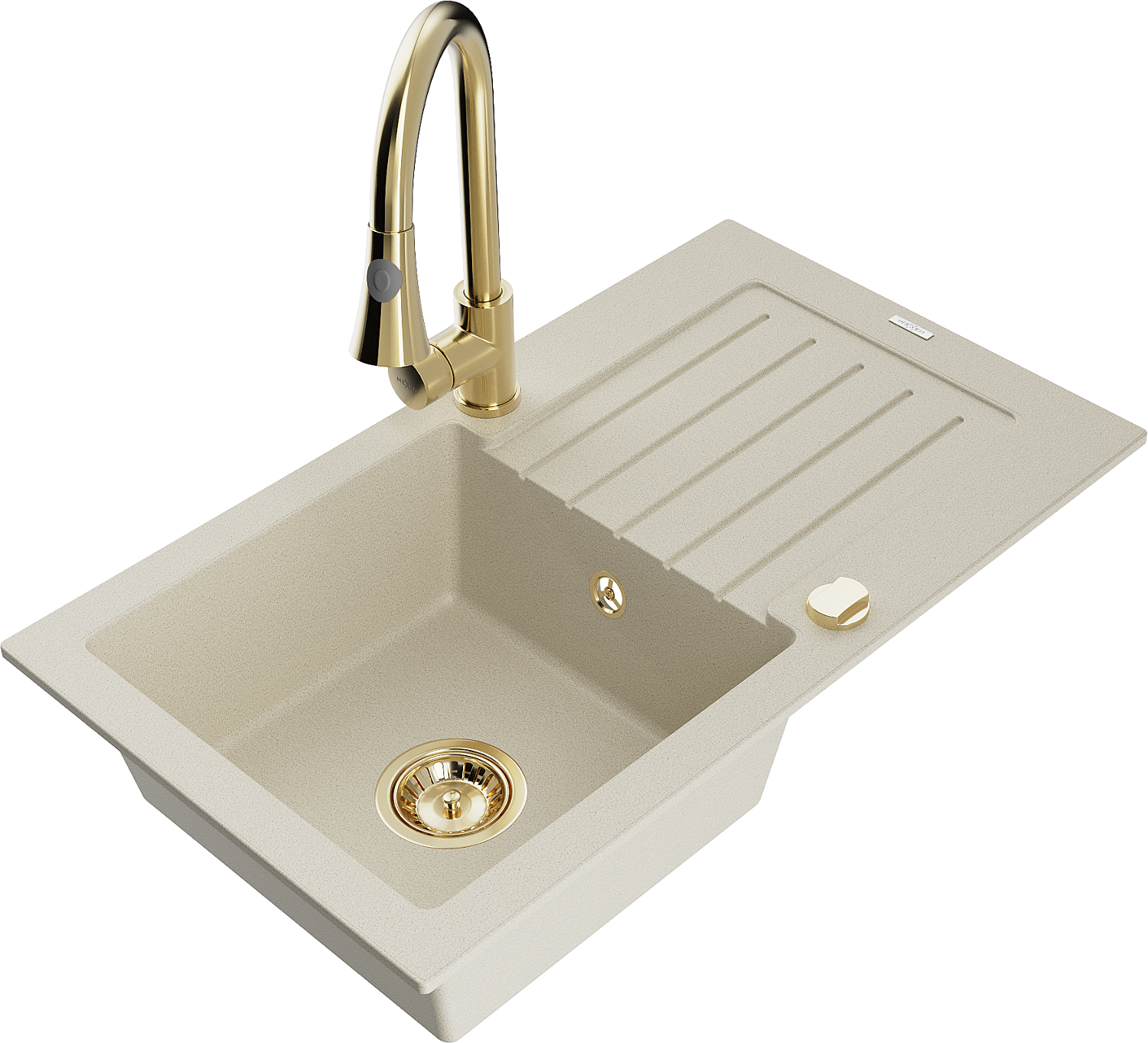 Mexen Pablo granitový kuchynský drez s 1 komorou a odkvapkávačom, s kuchynskou batériou Elia, béžový - 6510-69-670101-50