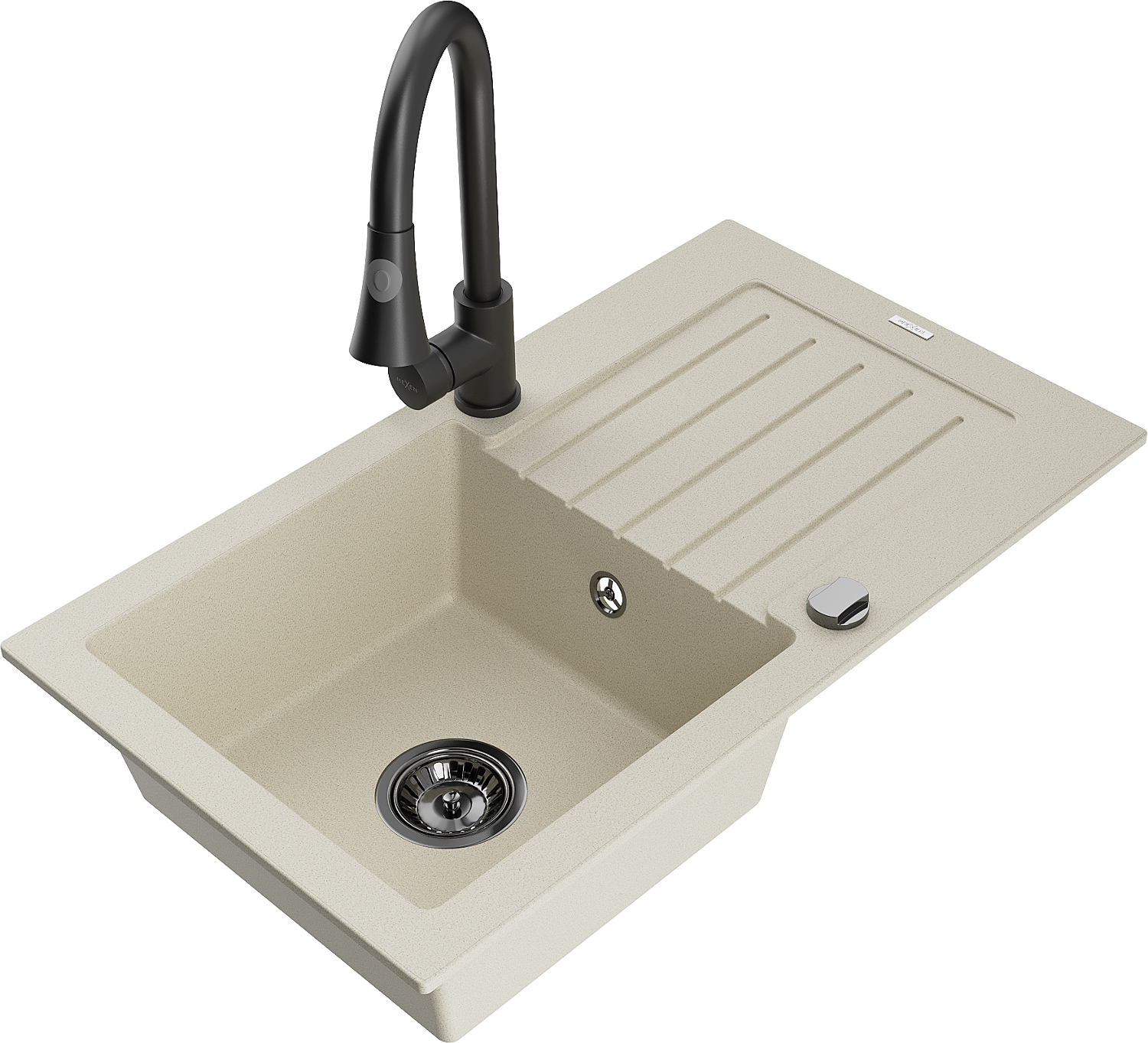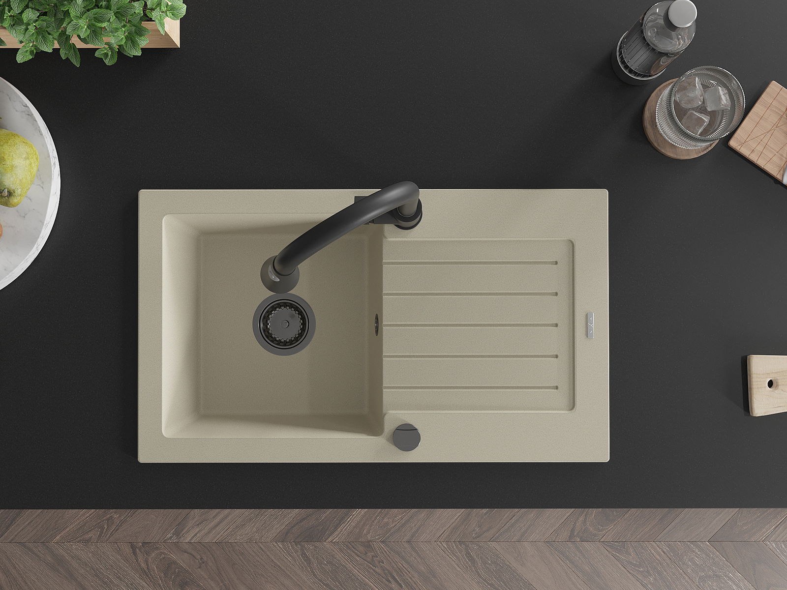 Mexen Pablo granitový drez s 1 komorou a odkvapkávačom a kuchynskou batériou Elia, béžový - 6510-69-670101-70