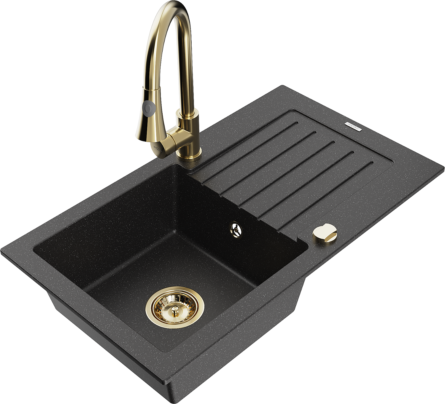 Mexen Pablo žulový kuchynský drez s 1 komorou a odkvapkávačom a kuchynskou batériou Elia, čierny/strieborný metalický