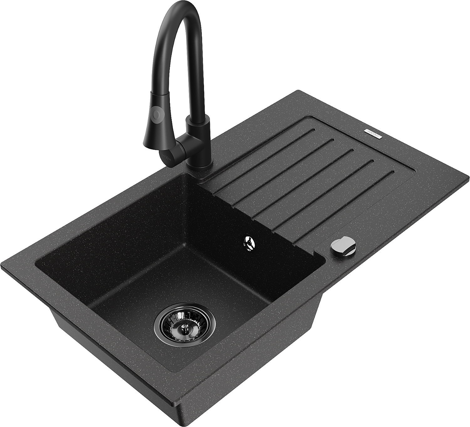 Mexen Pablo granitový drez s jednou komorou s odkvapkávačom a kuchynskou batériou Elia, čierny/strieborný metalický