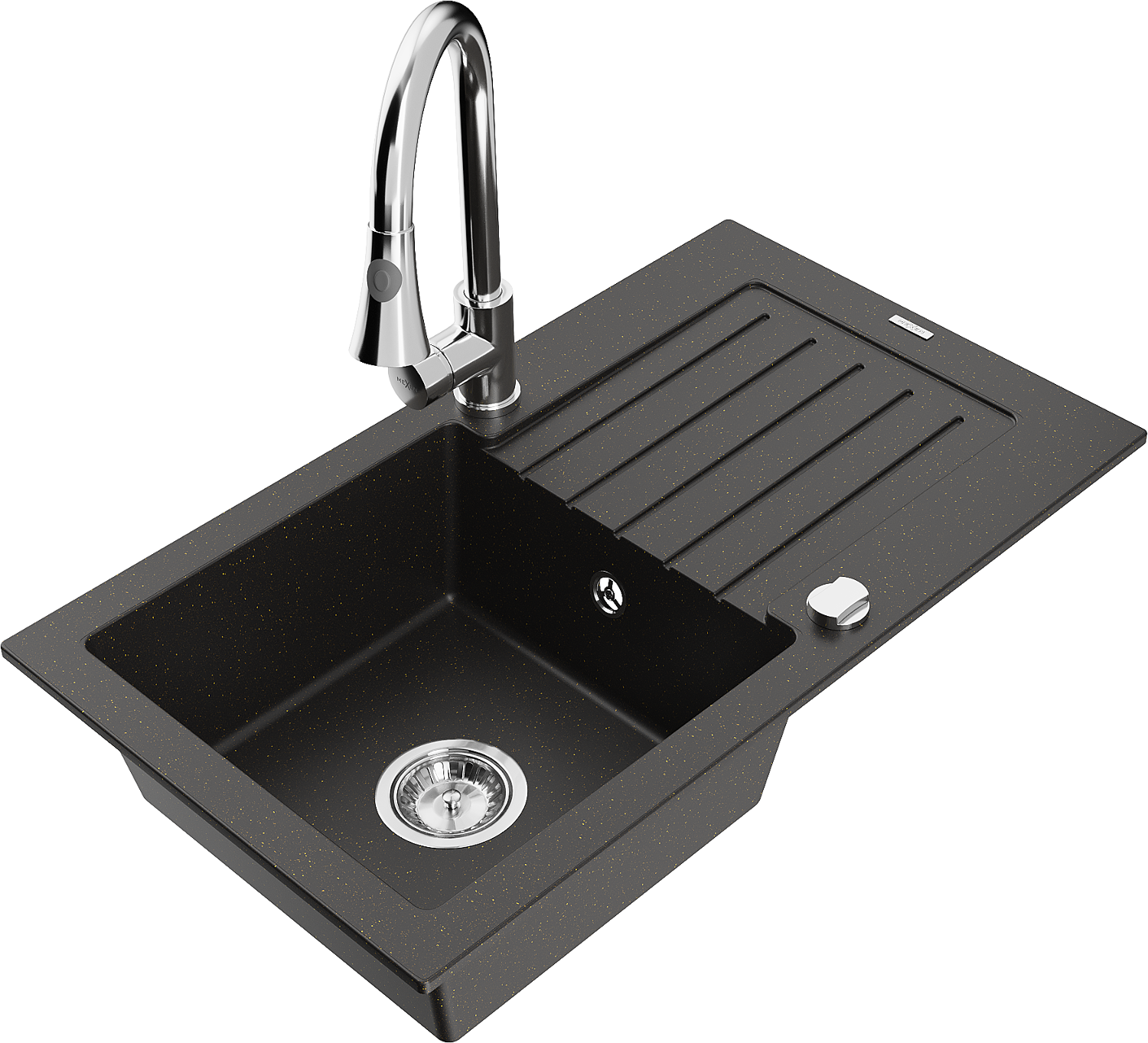 Mexen Pablo Granitový kuchynský drez s 1 komorou, odkvapkávacia plocha a kuchynská batéria Elia, čierna/zlatý metalický
