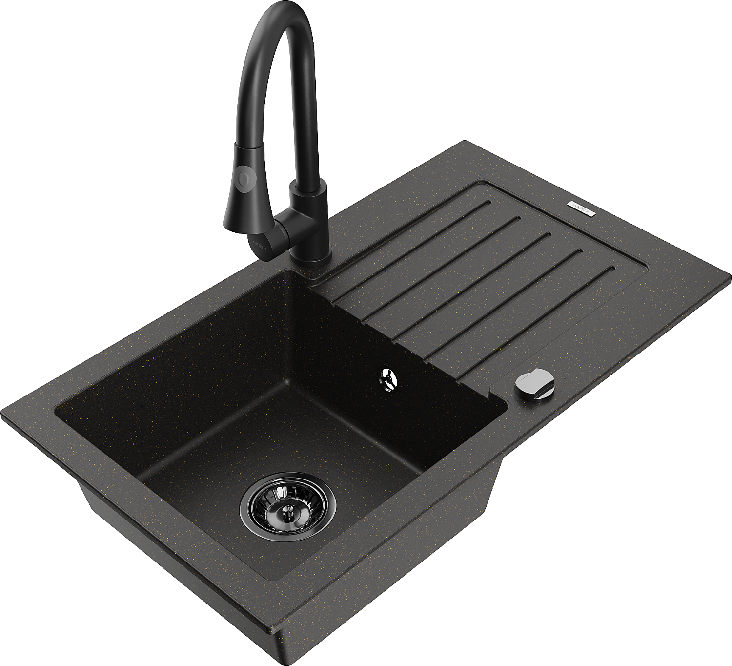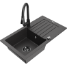 Mexen Pablo granitový drez s jednou komorou s odkvapkávacou plochou a kuchynskou batériou Elia, čierny/zlatý metalík