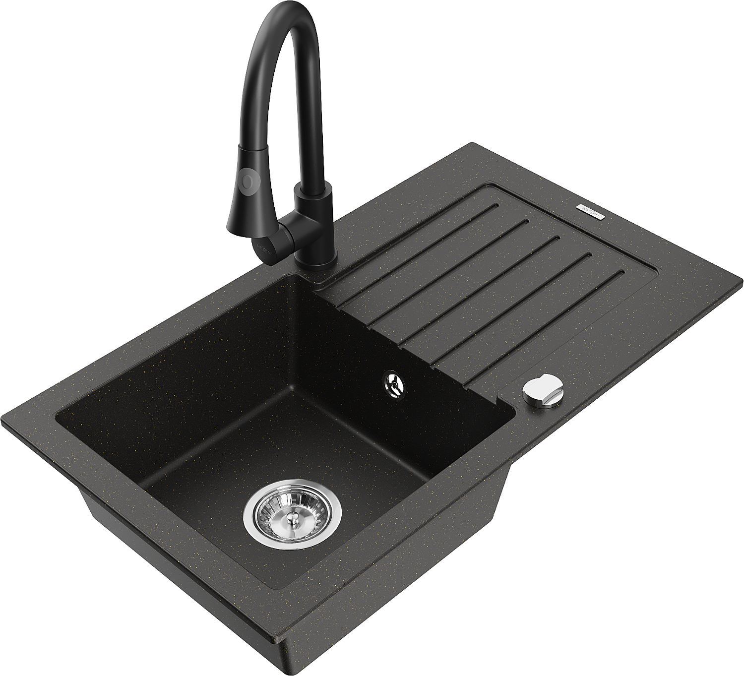 Mexen Pablo granitový drez s 1 komorou, odkvapkávačom a kuchynskou batériou Elia, čierny/zlatý metalik - 6510-75-670101-70